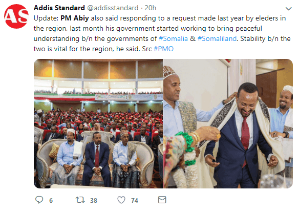 Abiy ayaa sidoo kale sheegay inuu daba socday arrinkani, codsi ka yimid odayaasha gobolka, kuwaasi oo ka dalbaday inay door ka qaatan sidii loo soo af-jari lahaa khilaafka Somaliya iyo Somaliland.