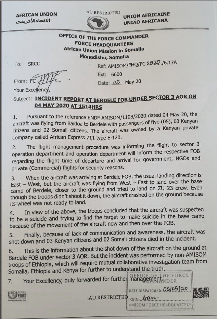 “Xiriir la’aan iyo wada-shaqeyn la’aan darteed ayaa lasoo riday diyaaradda, waxaana ku dhintay saddex qof oo Kenyan ah iyo laba qof oo Soomaali ah,” ayaa lagu yiri qoraalka.