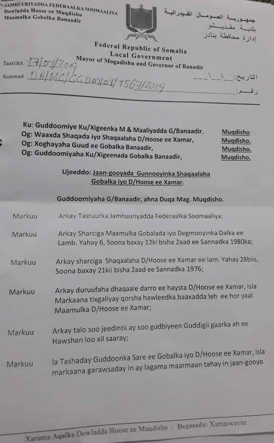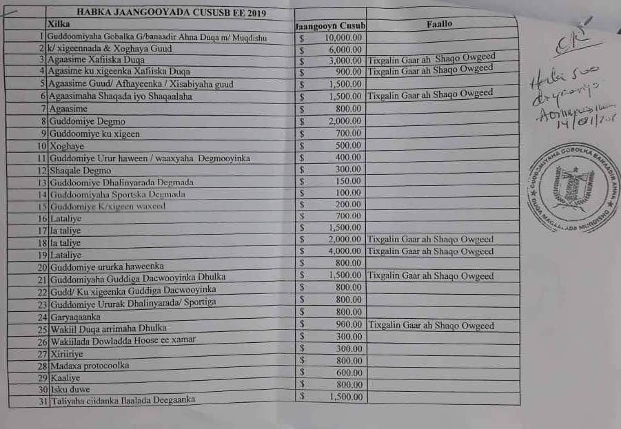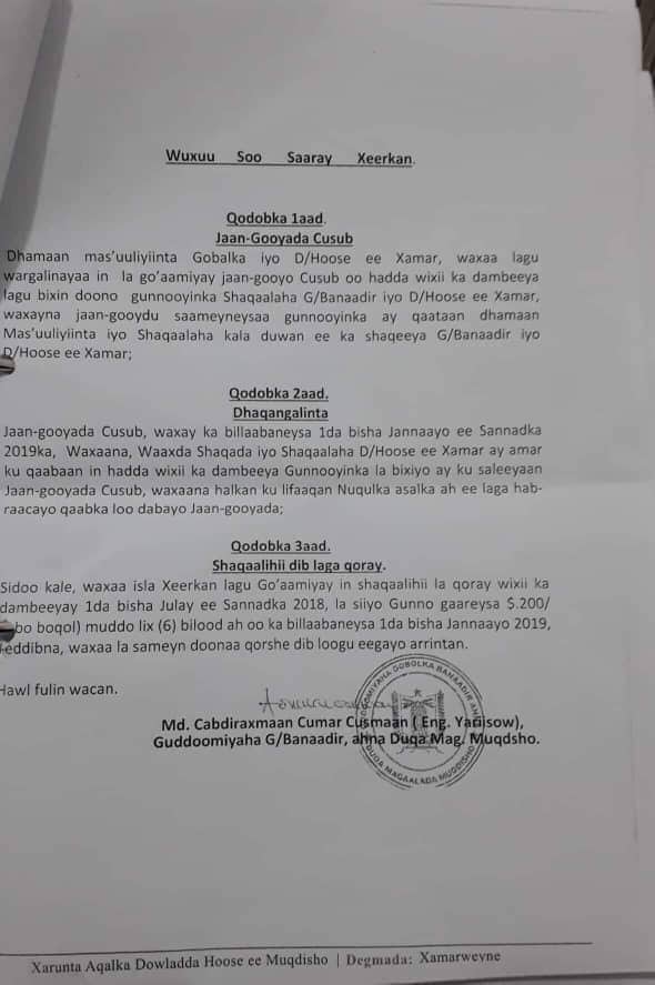 Muqdisho (Caasimada Online) – Gudoomiyaha Gobolka Banaadir ahna Duqa Magaalada Muqdisho Mudane Cabdiraxmaan Cumar Cusmaan (Yariisow) ayaa dhowaan soo saaray Jaangoynta Mushaarka Shaqaalaha iyo Mdaaxda Gobolka kaas oo dhaqangeli doona laga bilaabo bishan January 2019.