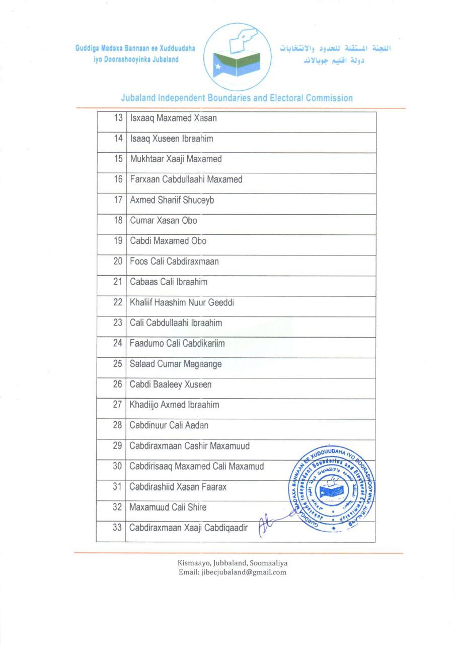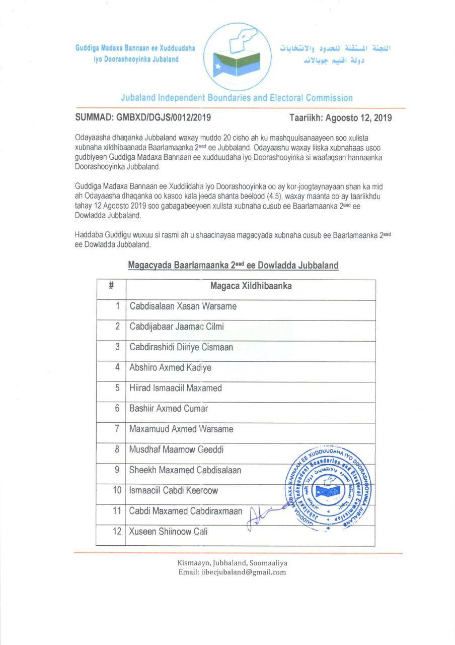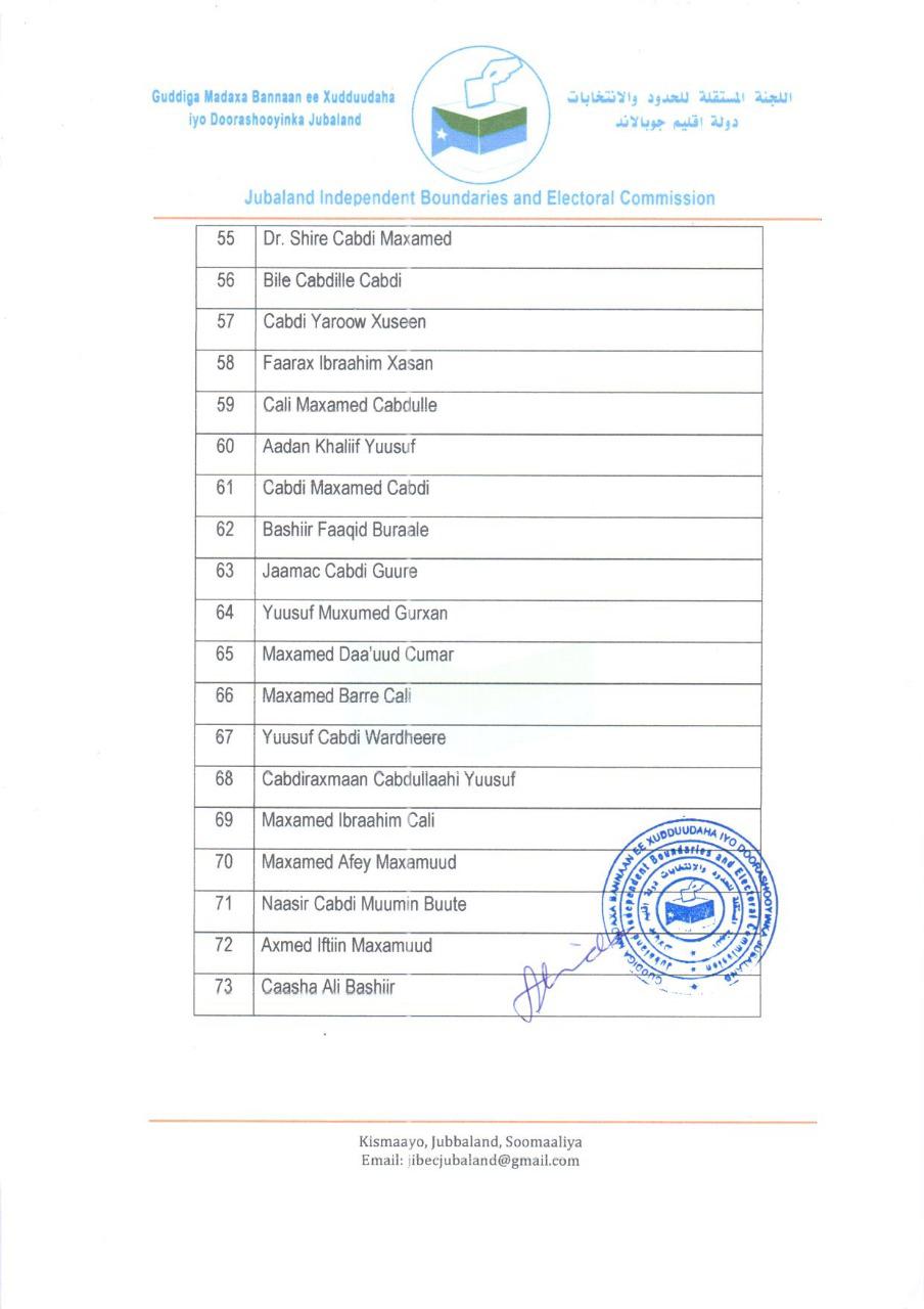 Kismaayo (Caasimada Online) – Guddiga madaxa banaan ee Xuduudaha iyo Doorashooyinka Jubbaland ayaa caawa ku dhawaaqay liiska Xildhibaanada Cusub ee Baarlamaanka labaad ee Dowlad Goboleedka Jubbaland.