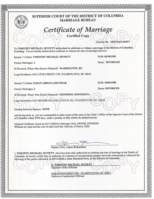 Shahaadada ayaa waxaa ka muuqata in Tim Mynett iyo Ilhaan Cumar ay is mehersadeen Arbacadii 11-ka March. Xafladda ayaa ka dhacday beerta John Marshall oo ku dhow maxkamadda Moultrie Courthouse, oo ay ka qaateen shahaadada nikaaxa.