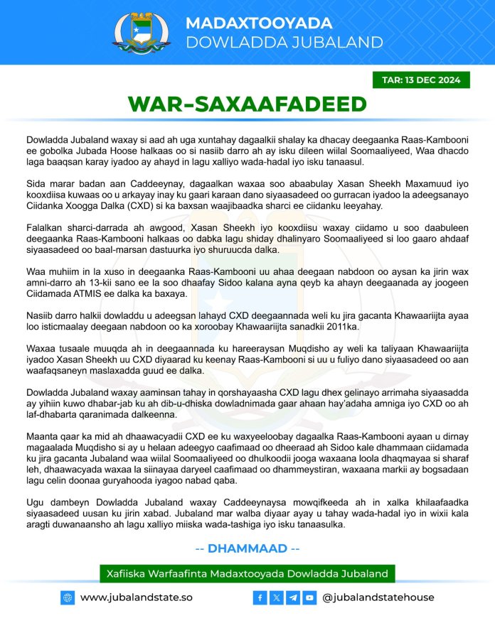 Ugu dambeyn Dowladda Jubaland waxay Caddeeynaysa mowqifkeeda ah in xalka khilaafaadka siyaasadeed uusan ku jirin xabad. Jubaland mar walba diyaar ayay u tahay wada-hadal iyo in wixii kala aragti duwanaansho ah lagu xalliyo miiska wada-tashiga iyo isku tanaasulka.