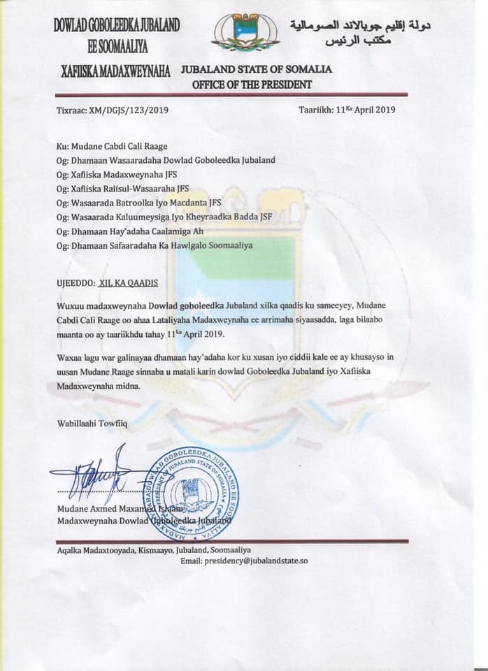 Axmed Madoobe ayaa warqad ogeysiin ah u diray hay’addaha Jubbaland, kuna wargeliyay in Cabdi Cali Raage uusan dowlad goboleedka Jubbaland matali karin laga bilaabo maanta.