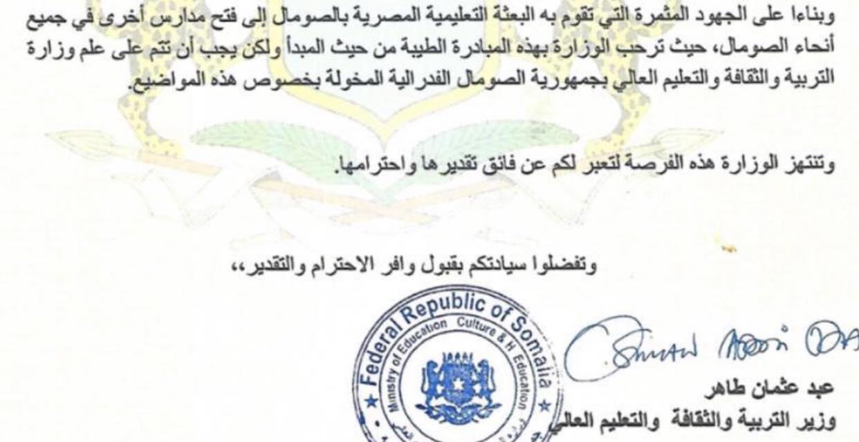 Goobjoog ayaa heshay warqad uu wasiirkii waxbarashada Cabdi Cusmaan Daahir u diray dhiggiisa Masar Dhaariq Showqi, kuna taariikheysan June 6, 2018 isaga oo ammaanay barnaamijka waxbarasho ee Masaaridu ka wadaan gudaha Soomaaliya laakin ka codsaday in aan la qaadin tallaabo aaney ka warqabin wasaaradda waxbarashada. Wasiir Cabdi Daahir oo aan warqadda aan wax ka weydiinay waxaa uu sheegayaa in aanu xilligaas khilaaf jirin balse uu ku wargeliyey Masaaridu in wasaaradda la ogeysiiyo shaqada socota, si wax u fududeyso, laguna saleeyo iskuulada la furayo baahida deegaanka. Waxaa muuqata in Masaaridu ay hawlahooda sii wateen iyaga oo bilo kadib iskuulka Kamaalu-diin ka furay Burtinle.