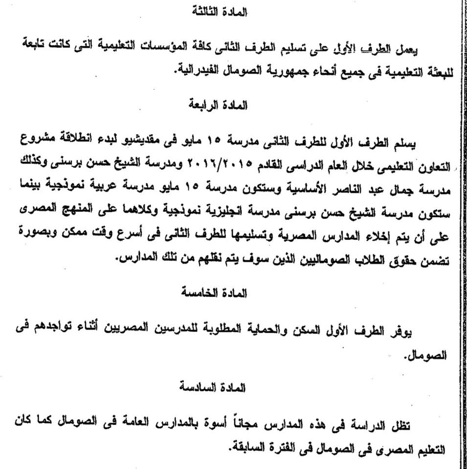 Heshiiskan oo aan helnay waxaa xilligaas qalinka ku duugay wasiirka waxbarashada Soomaaliya Khadar Bashiir Cali iyo dhigeeda Masar Dr. Muxib Maxmuud Kaamil waxa’uuna ka koobnaa 13 qodob, oo ay ka mid ahaayeen in labada dhinac iska kaashadaan in dib loo howlgeliyo iskuuladii Masar ee Soomaaliya oo ardeyda wax lagu baro, lagu tababaro macalimiinta, in Soomaaliya ay Masar ku wareejiso iskuuladdii ay ku laheyd dalka lagana bilaabo 15 May, Sheekh Xasan Barsane iyo Jamaal Cabdinaasir, in Soomaaliya ay amniga sugto halka Masarna macalimiinta, manhajka, tababarka iyo dhammaan barnaamijka ay dusha saarato, waxaa kale oo heshiiska ku jiray in wixii khilaaf ah labada dhinac ka wada hadlaan xataa haddii wax laga badalayo.