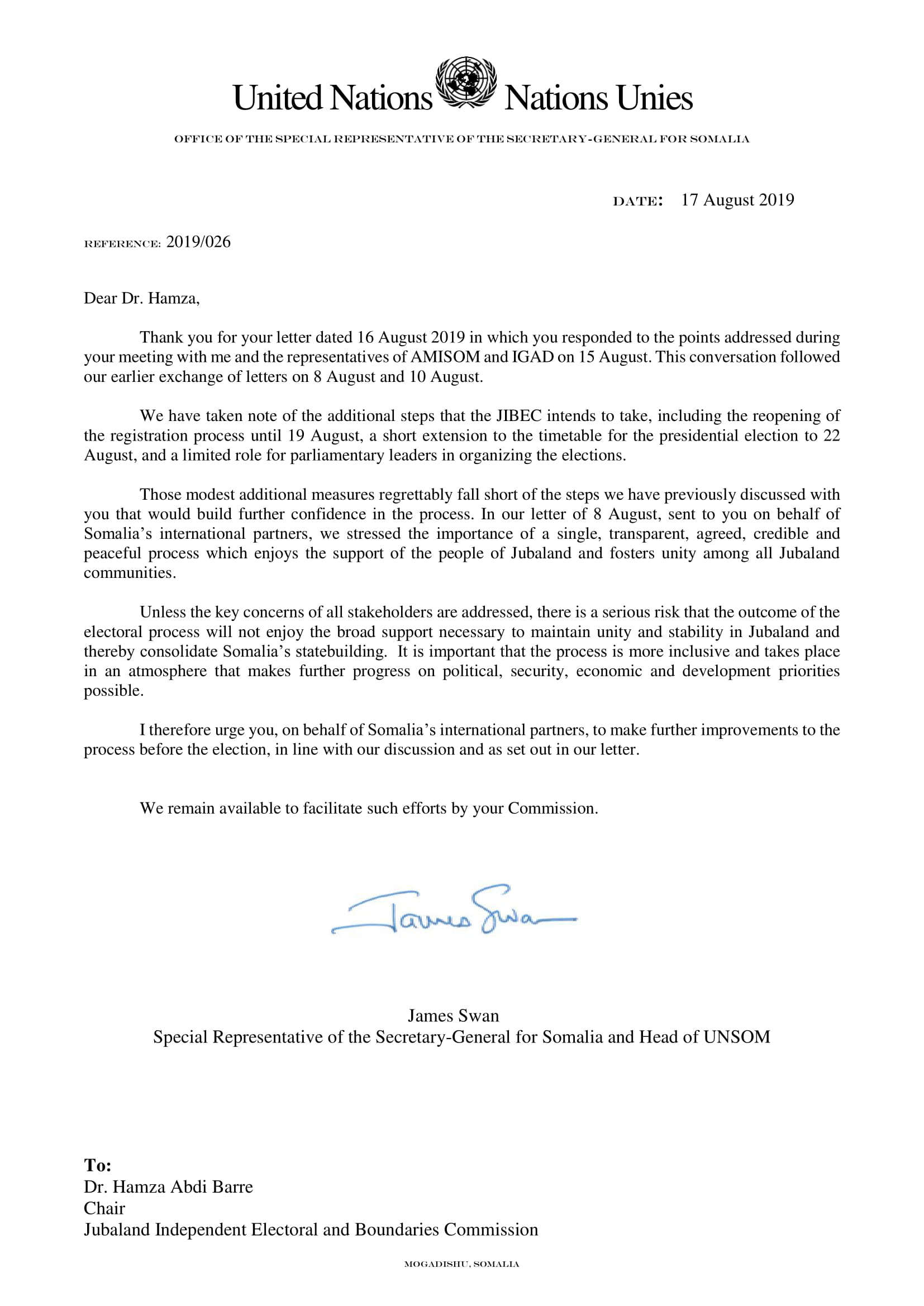 Muqdisho (Caasimada Online) – Wakiilka QM ee Soomaaliya, James Swan ayaa qoraal jawaab ah u diray guddoomiyaha guddiga doorashada Jubaland, Xamza Cabdi Barre taasi oo la xiriirtay go’aankii guddiga uu shakay ku dhowaaqay ay dib ugu fureen is-diiwaan gelinta musharaxiinta madaxweynaha, islamarkaana saddex maalmood ay dib ugu dhigaan doorashada madaxweynaha.