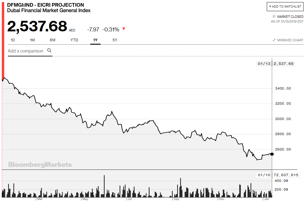 Waxaa si weyn hoos ugu dhacay suuqa Dubai, hoos u dhacan ayaa gaarayey in dhaw 30% marka loo eego bilihii hore ee sanadkii tagay 2018, wuxuuna noqonayaa hoos u dhacan ku yimid suuqa Dubai kii ugu weynaa ee in mudda ah soo wajaha maamulkaasi, waxaana xusid mudan in suuqa Dubai uu weli hoos usii dhacayo.