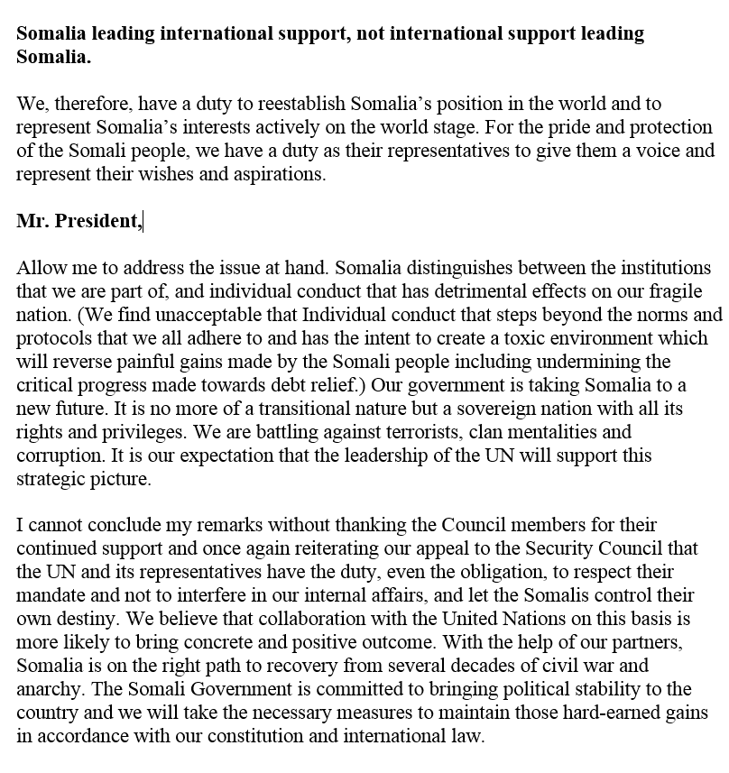 Masoo geba gebeyn karo hadlakayga aniga oo aan xubnaha golaha ammaanka uga mahad-celin taageeradooda joogtada ah, islamarkaana aan mar kale ku celin inaan ka codsado Golaha Ammaanka iyo QM iyo wakiiladeeda in waajib uu ku saaran yahay inay xushmeeyaan shaqada loo igmaday, islamarkaana aysan faro-gelin arrimaheena gudaha, ayna Soomaalida u ogolaadaan inay ayaga maamulaan aayahooda. Waxaan aaminsannahay wada-shaqeyn QM aan la yeelanno oo arrimahan saldhig looga dhigay ay yeelan doonaan miro-dhal wanaagsan. Dowladda Soomaaliya waxaa ka go’an inay ilaaliso guulihii la gaaray si waafaqsan dastuurkeena iyo xeerarka caalamiga ah.