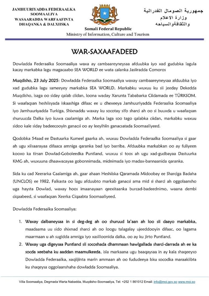 Muqdisho, 23 July 2025: Dowladda Federaalka Soomaaliya waxay cambaareyneysaa afduubka iyo xad gudubka lagu sameeyey markabka SEA WORLD. Markabku wuxuu ku sii jeeday Dekedda Muqdisho, isaga oo siday qalab ciidan, loona waday Xarunta Tababarka Ciidamada ee TÜRKSOM.