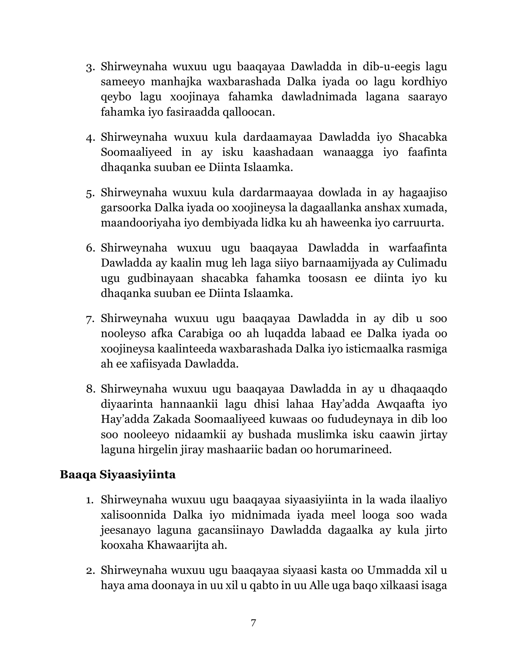 - In kooxaha khawaarijta oo ay ugu horreeyaan Khawaarijta Alshabaab iyo Daacish aysan lahayn wax sharciyad diineed ah iyada oo la burinayo fasiraadaha gurracan ee aan salka laheyn diinteena Islaamka;