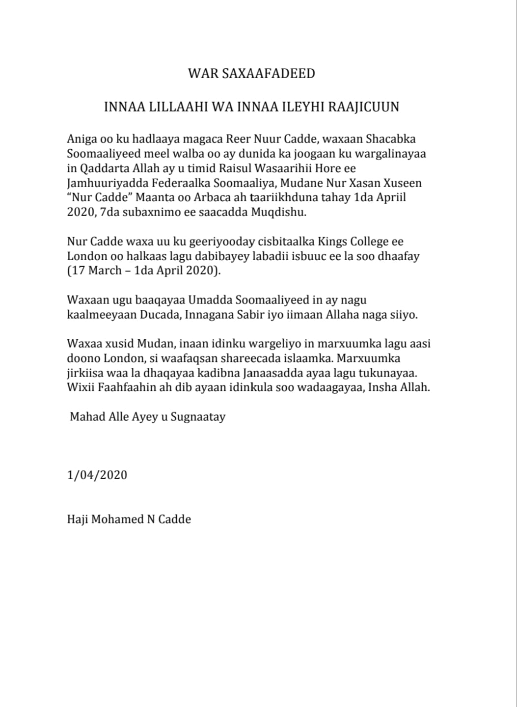 Geerida ku timid ra’iisul wasaarihii hore ee dalka, marxuum Nuur Cadde, ayaa waxaa warbaahinta u xaqiijiyey, Xaaji Maxamed Nuur Cadde.