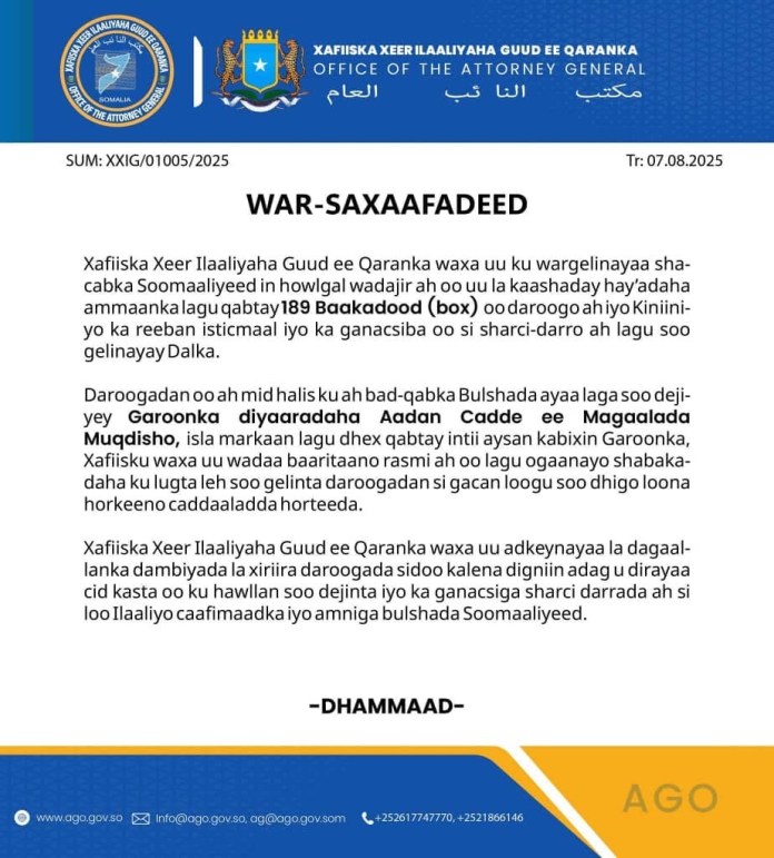 Xafiiska Xeer Ilaaliyaha Guud ee Qaranka waxa uu ku wargelinayaa shacabka Soomaaliyeed in howlgal wadajir ah oo uu la kaashaday hay’adaha ammaanka lagu qabtay189 Baakadood (box) oo daroogo ah iyo Kaniini oo ka reeban isticmaal iyo ka ganacsiga oo si sharci-darro ah lagu soo gelinayay Dalka,” ayaa lagu yiri qoraalka.