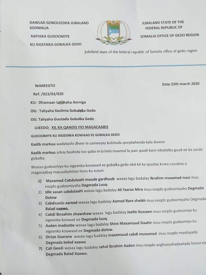 Beled-Xaawo (Caasimada Online) – Maamulka Gobolka Gedo ee hoosyimaada Dowladda Federaalka ayaa is bedel ku sameeyay Gudoomiye-yaashii Degmooyinka Luuq, Doolow iyo Beled Xaawo ee Gobolkaasi Gedo.