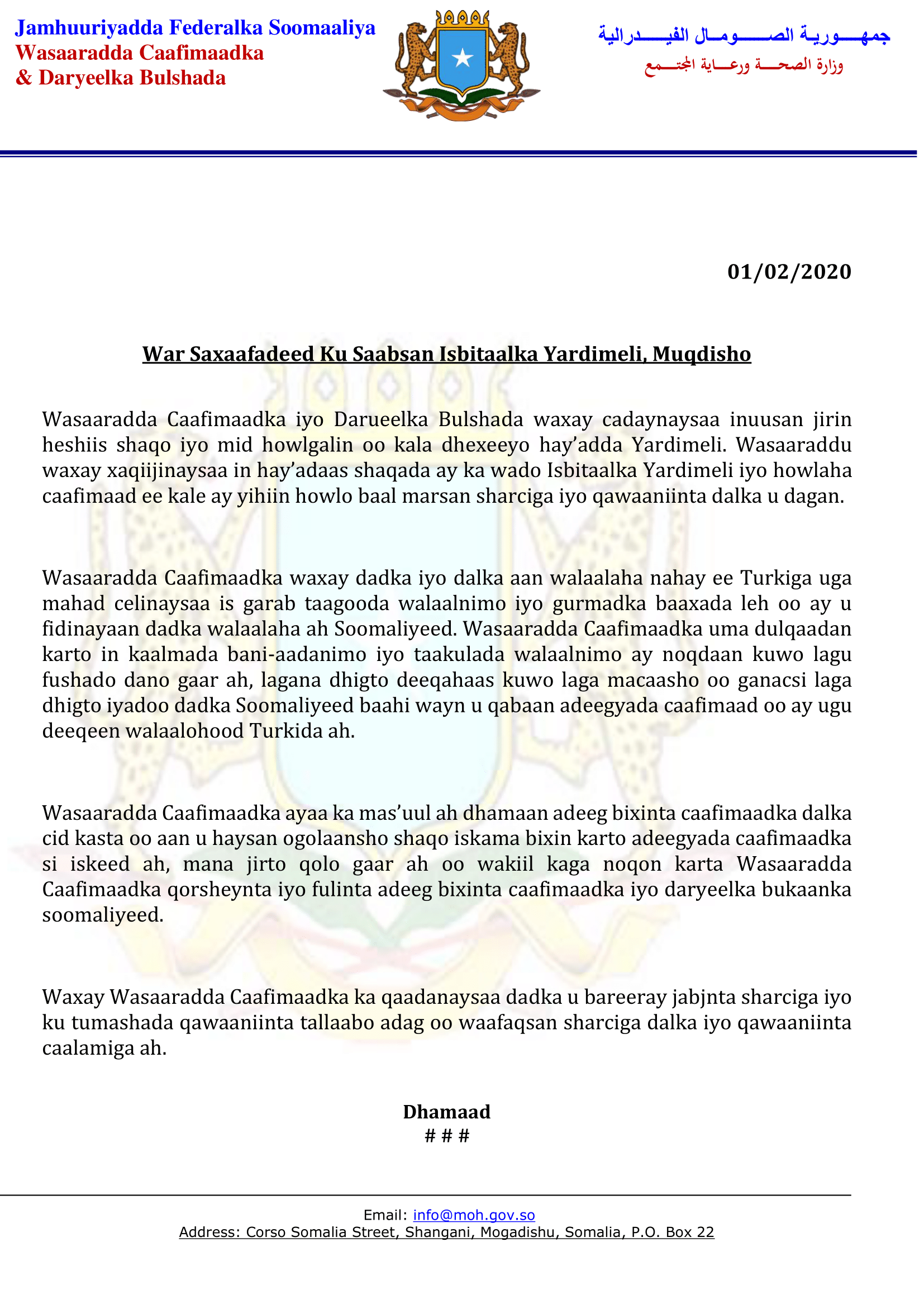 Wasaaradda Caafimaadka ayaa dhinaca kale sheegtay inay dadka iyo dalka aan walaalaha nahay ee Turkiga uga mahad celinayso is garab taagooda walaalnimo iyo gurmadka baaxada leh oo ay u fidinayaan dadka walaalaha ah Soomaliyeed.