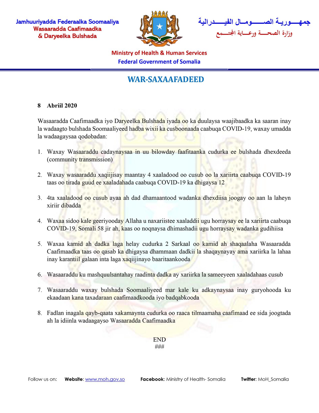 “ Wasaaraddu waxay bulshada Soomaaliyeed mar kale ku adkaynaysaa inay guryohooda ku ekaadaan kana taxadaraan caafimaadkooda iyo badqabkooda. Fadlan inagala qayb-qaata xakamaynta cudurka oo raaca tilmaamaha caafimaad ee sida joogtada ah idiinla wadaagayso Wasaaradda Caafimaadka” ayaa lagu soo gaba-gabeeyey qoraalka wasaaradda caafimaadka Soomaaliya.