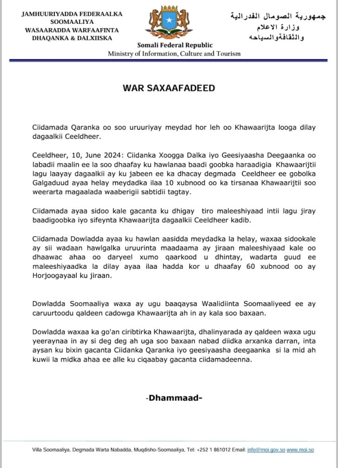 “Dowladda waxaa ka go’an ciribtirka Khawaarijta, dhalinyarada ay qaldeen waxa ugu yeeraynaa in ay si deg deg ah uga soo baxaan nabad-diidka arxanka darran, inta aysan ku bixin gacanta Ciidinka Qaranka iyo geesiyaasha deegaanka, si lamid ah kuwii la midka ahaa ee alle ku ciqaabay gacanta ciidamadeenna,” ayaa lagu yiri warka dowladda.