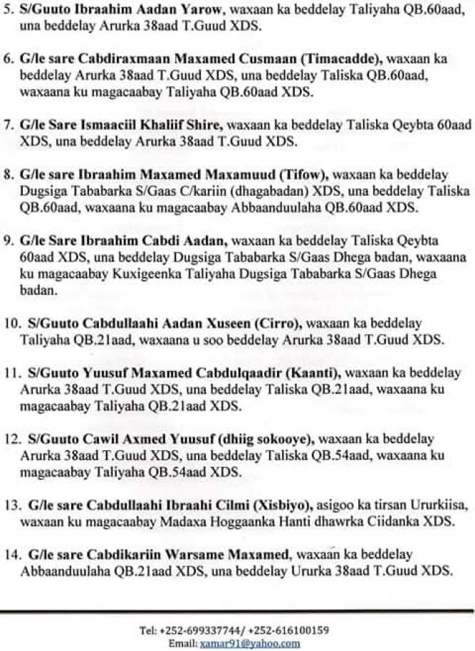 Sidoo kale waxaa xilka laga qaaday taliyahii qeybta 27-aad ee ciidamada xoogga ana howl galeysay HirShabelle sarreeye guuto Maxamuud Koronto, waxaana xilkaas loo magacaabay Jeneraal Tareedisho.