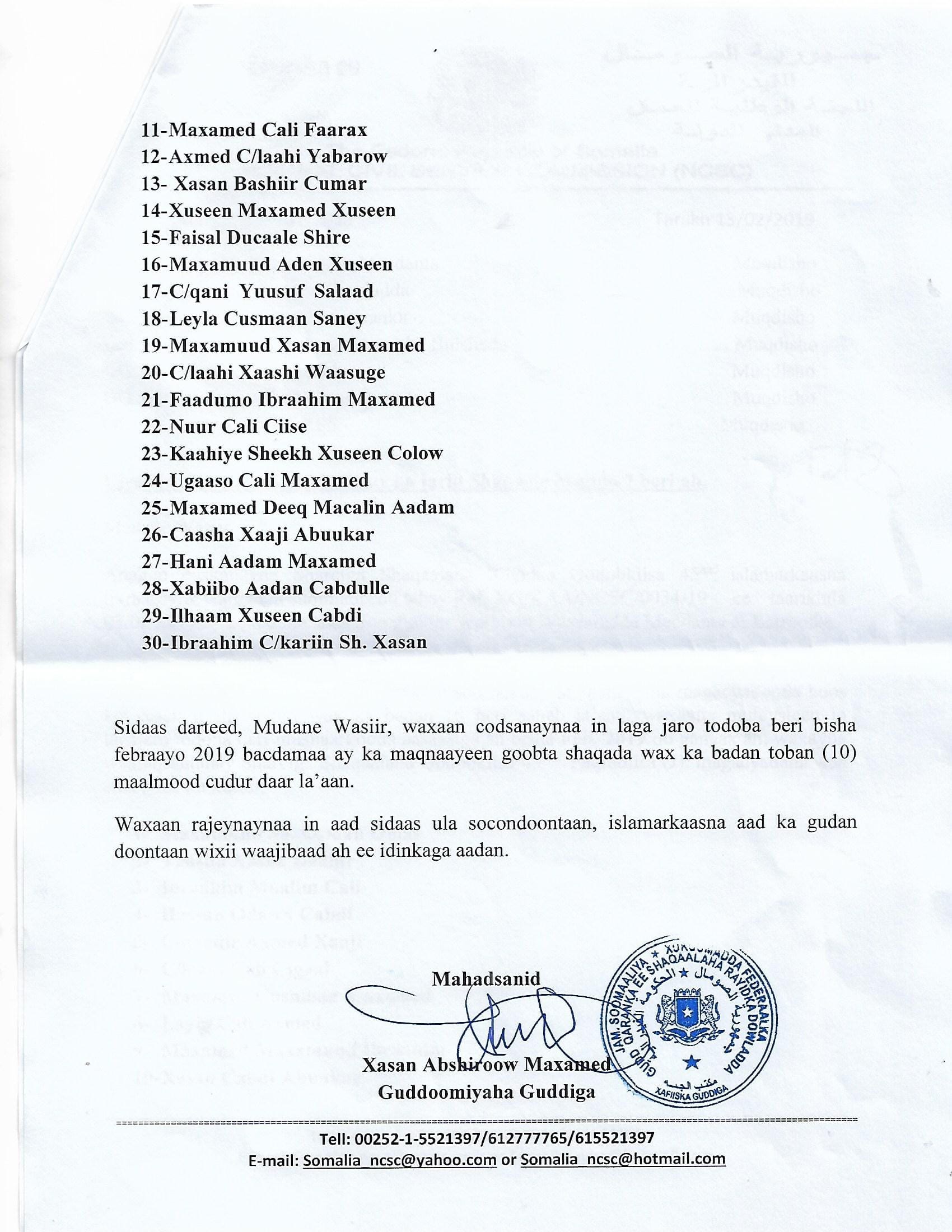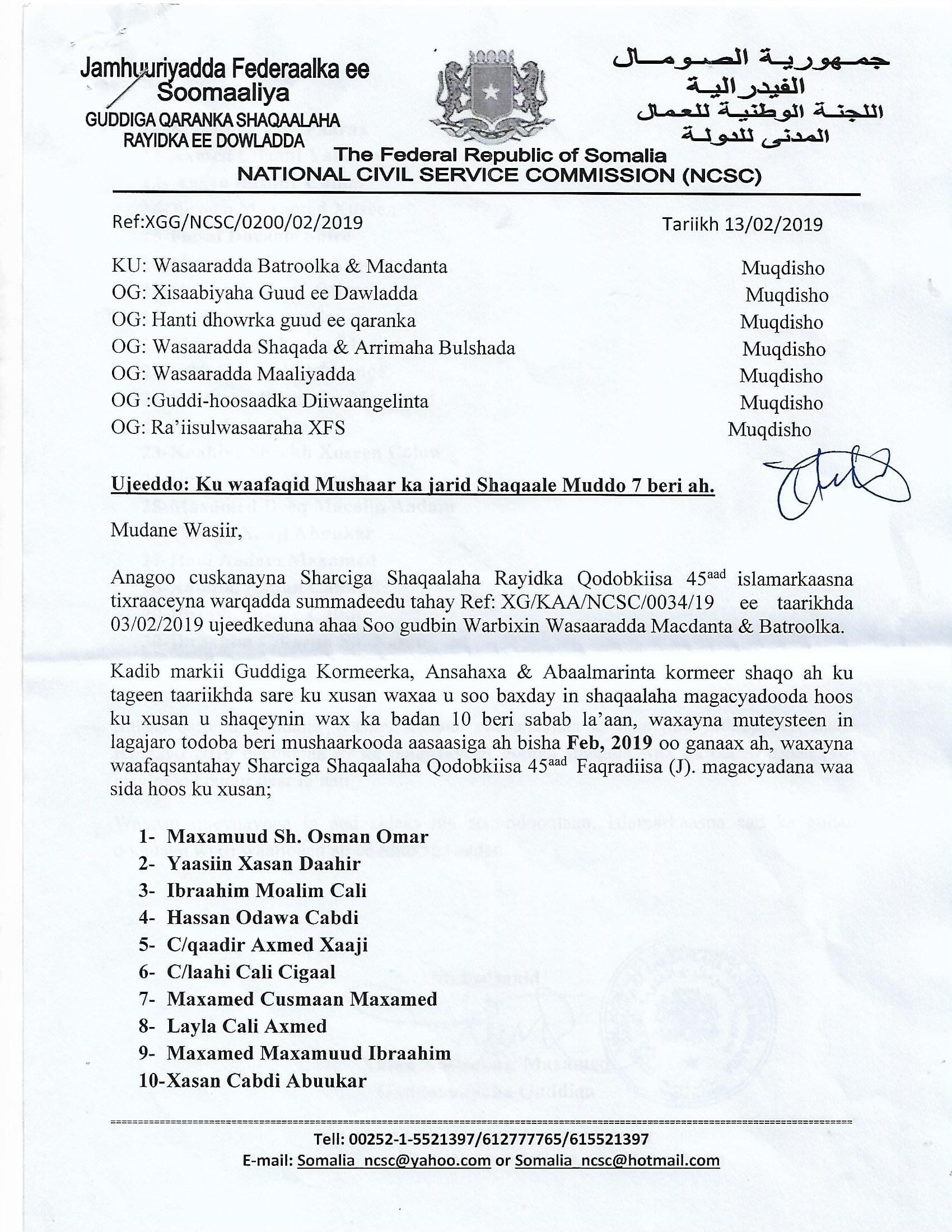 Warqadda mushaharka looga ganaxaaay muddo bil ah oo uu saxiixay guddoomiyaha guddiga, ayaa waxaa loo diray wasiirka macdanta iyo batroolka Soomaaliya.
