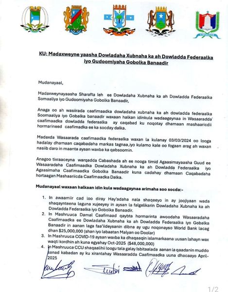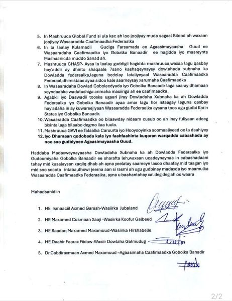 1- In wasaaradda caafimaadka heer federaal ay hey’adaha ku amartay in aysan la shaqey karin wasaaradaha caafimaadka dowlad goboleedyada iyo gobolka Banaadir.