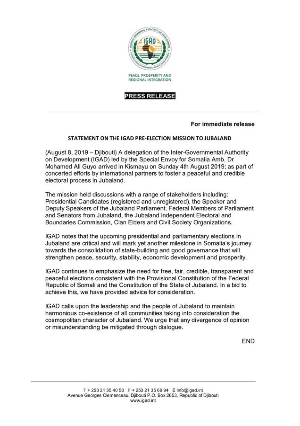 Sidoo kale wuxuu tilmaamay in IGAD ay caddeyneyso in ahmiyad gaar ah ay leedahay doorashada baarlamaanka iyo mida madaxweynaha ee Jubbaland ka dhaceysa dhammaadka bishan..