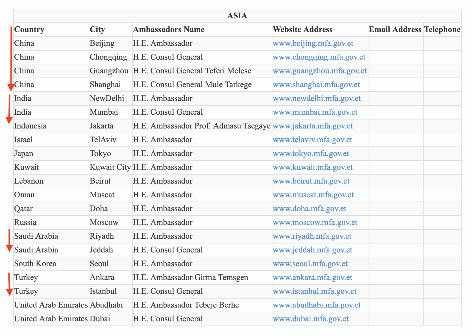 In arrintan aysan ahayn qalad qoraal oo ay tahay ku talo-gal iyo waxa Itoobiya aaminsan tahay waxaa caddeynaya in dhammaan dalalka kale ee ay ku leeyihiin safaaradaha iyo qunsuliyadaha ay magacaabeen kaliya hal dal iyo dhowr magaalo, sida China, India, Saudi Arabia, Turkey iyo dalal kale. Eeg sawirka hoose.