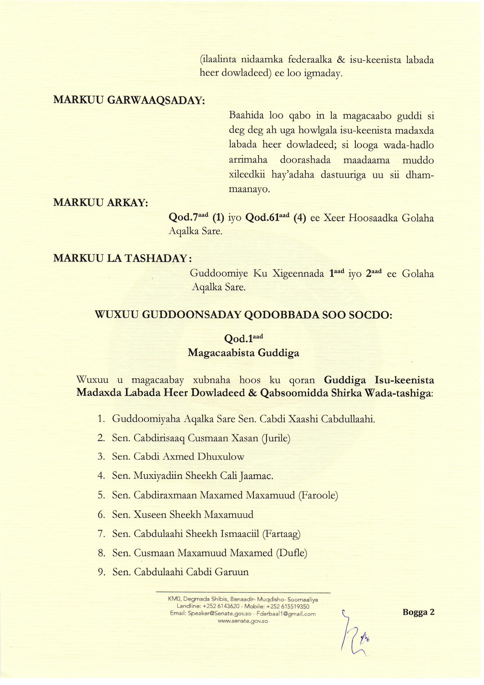 1 – Guddoomiyaha Aqalka Sare Senator Cabdi Xaashi Cabdullaahi.