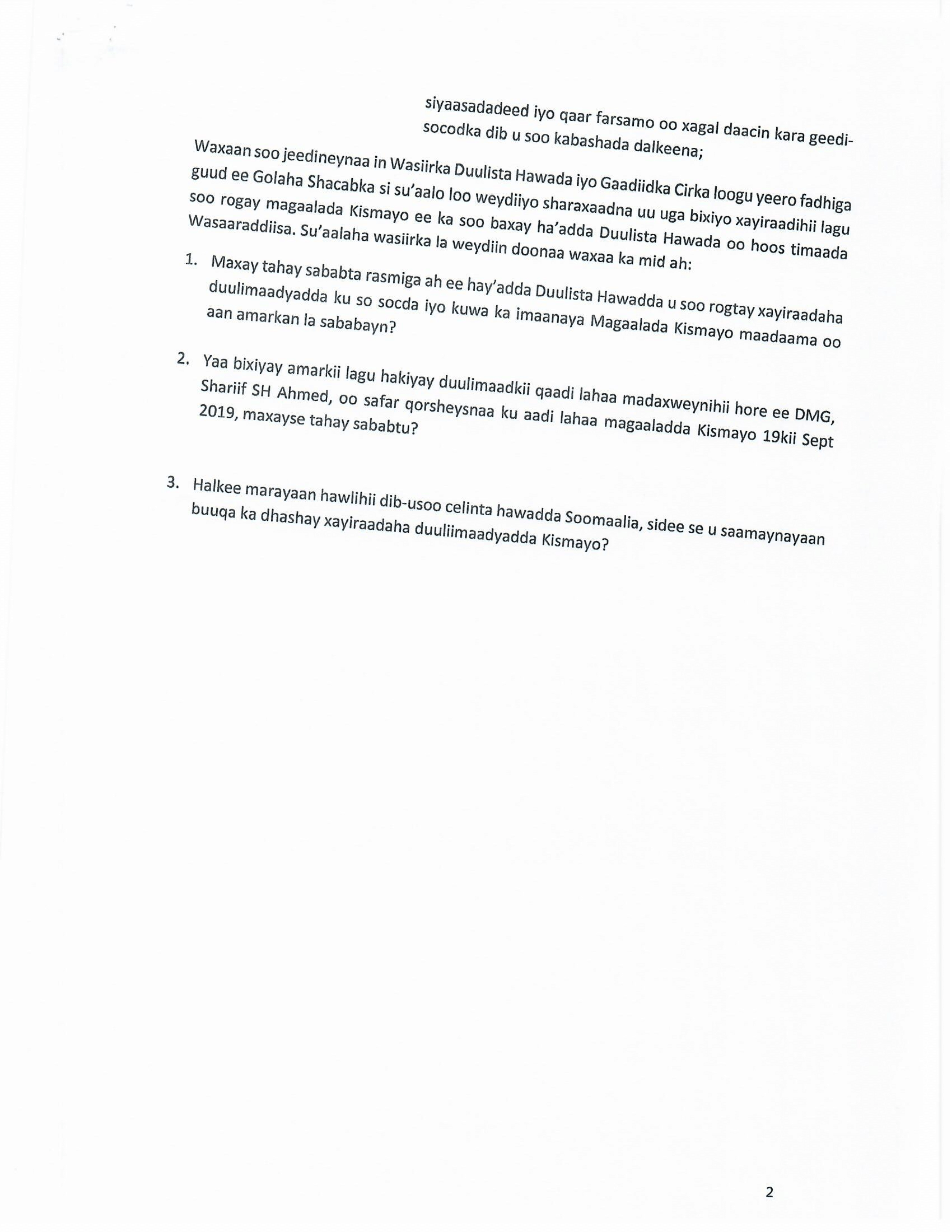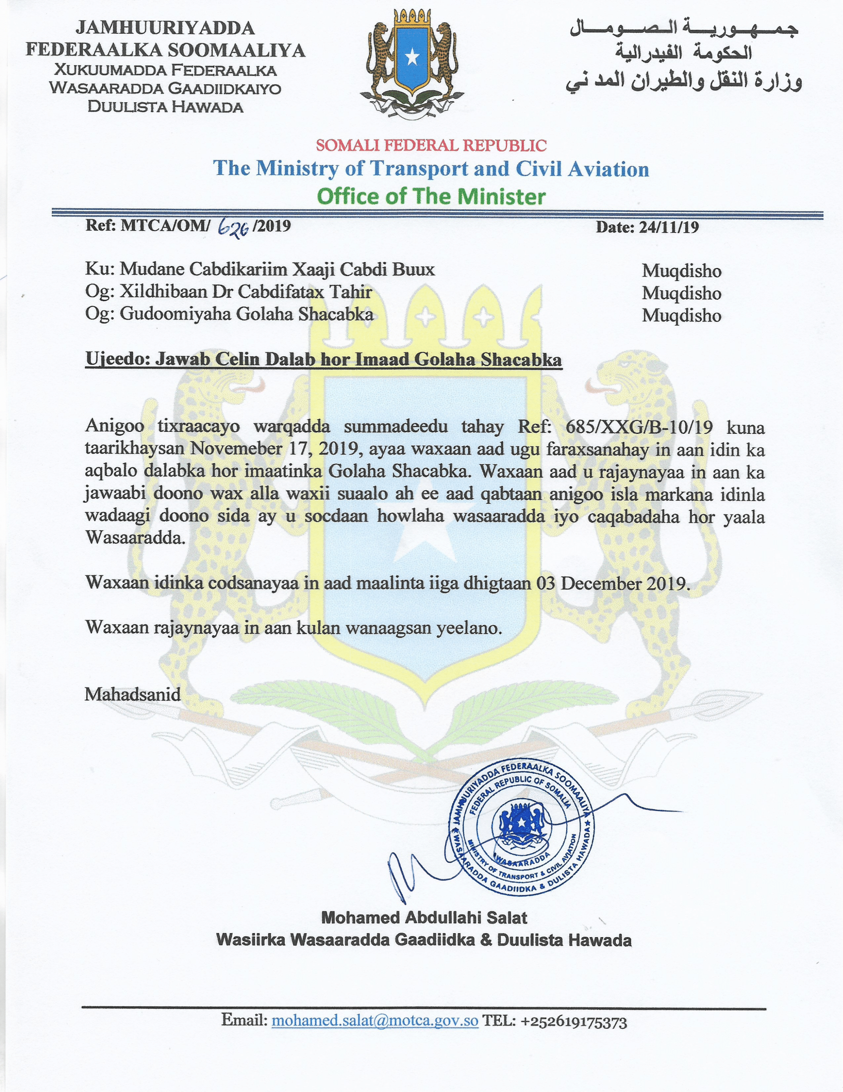 Oomaar ayaa waxaa 17-kii November guddoonku u diray warqad loogu yeeray kadib markii ay dalbadeen xildhibaano ka tirsan golaha shacabka, si su’aalo looga weydiiyo xadgudubyadii ay sameysay hay’adda duulista oo xildhibaano iyo madaxweynayaal hore ka hor-istaagtay inay ka duulaan garoonka diyaaradaha Muqdisho.