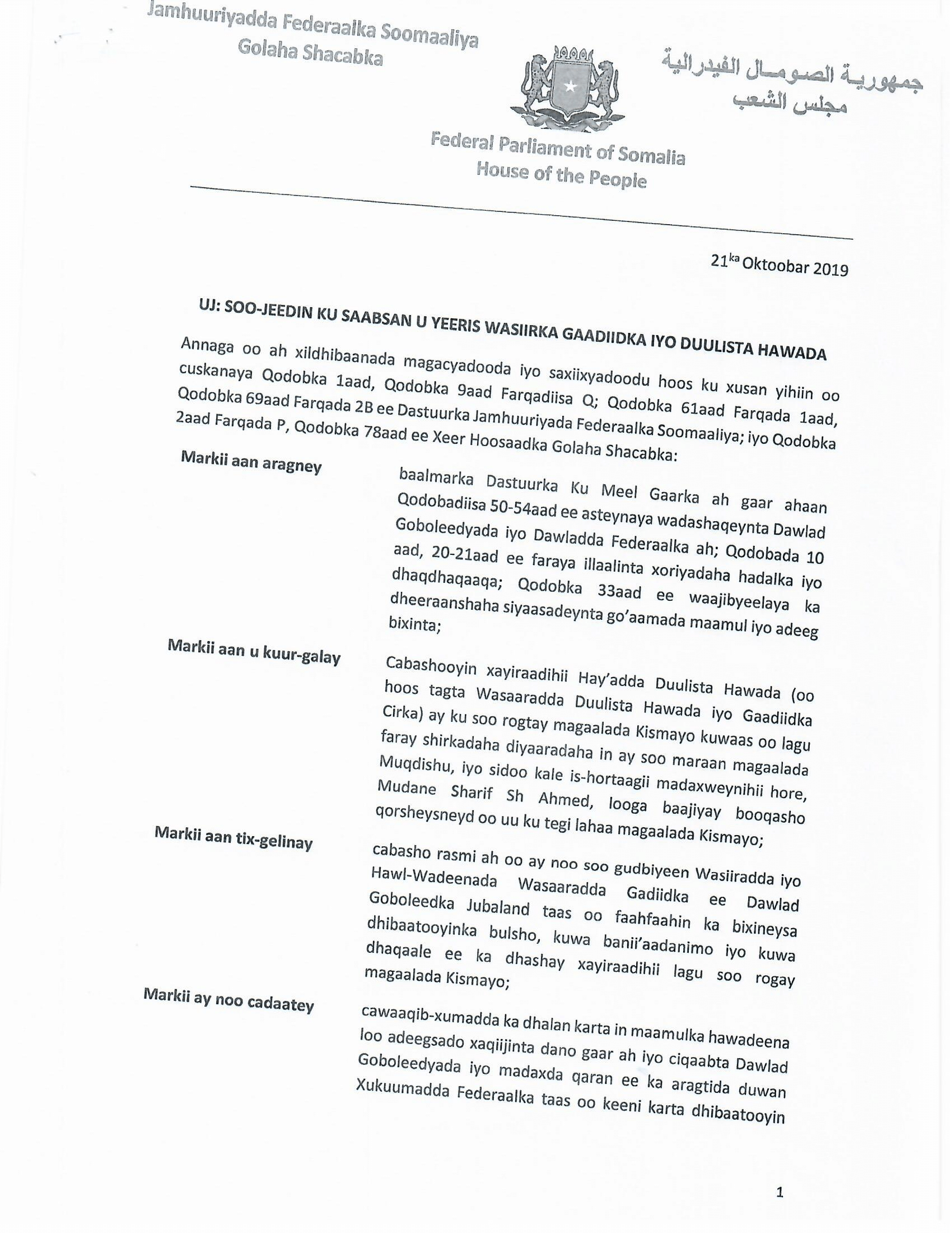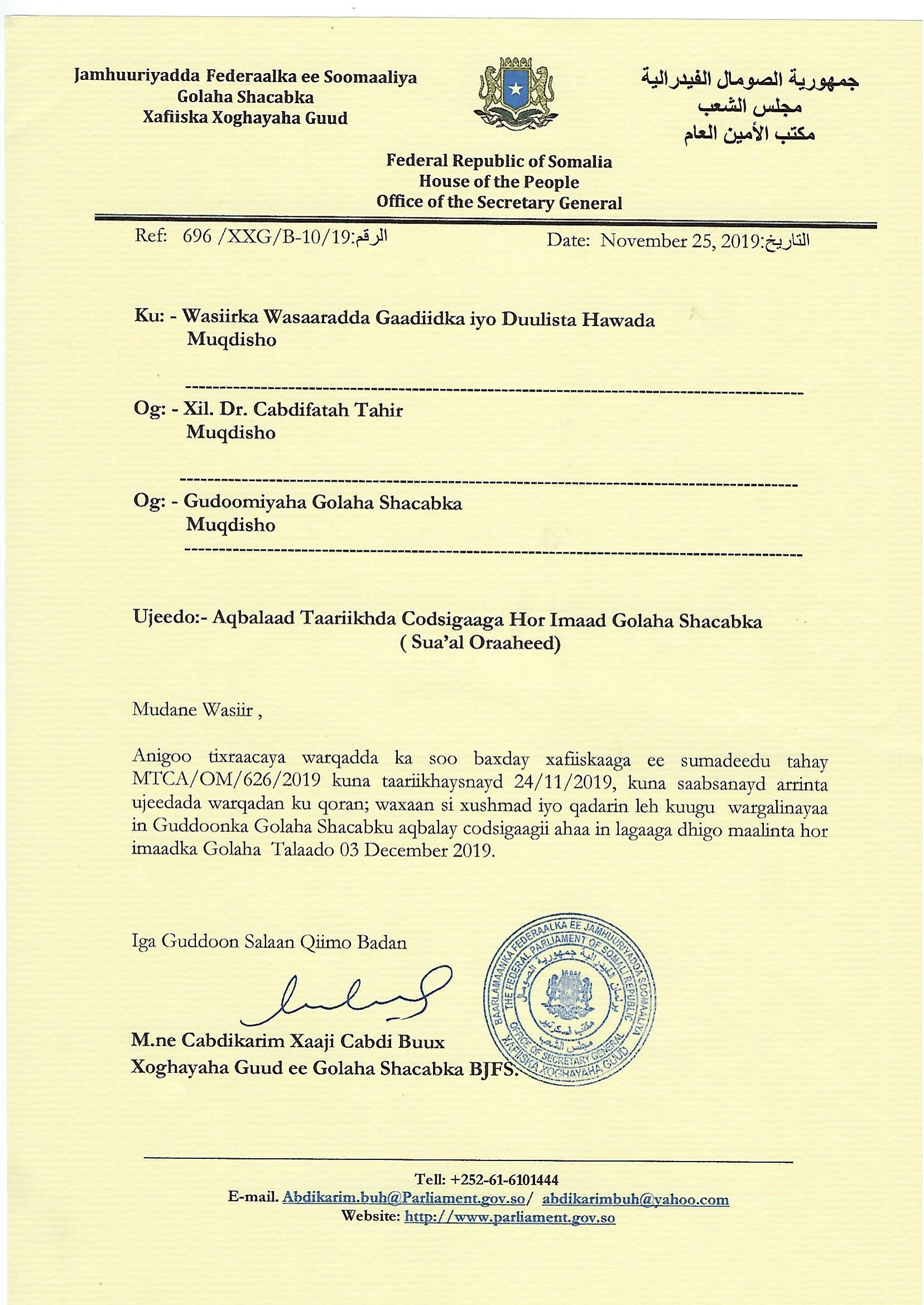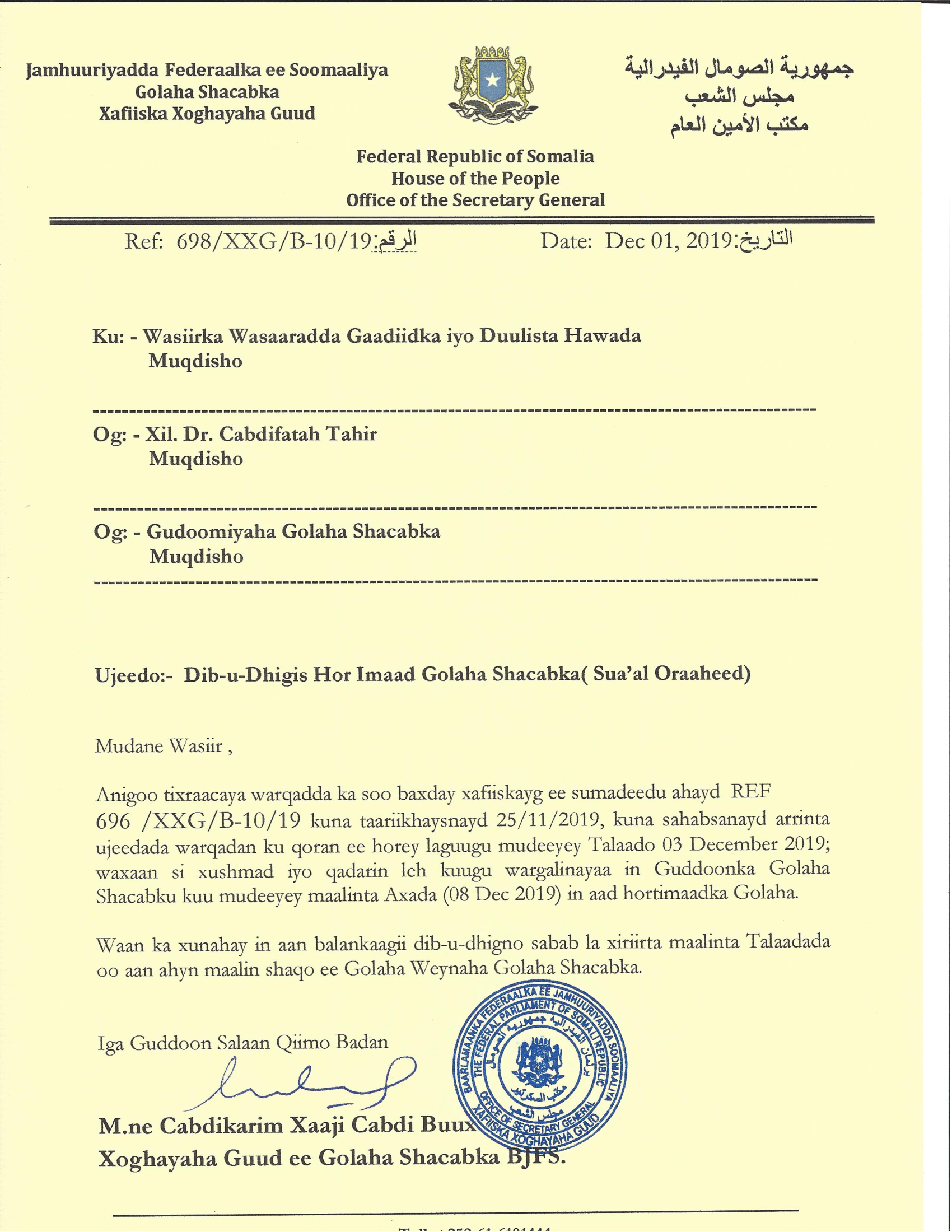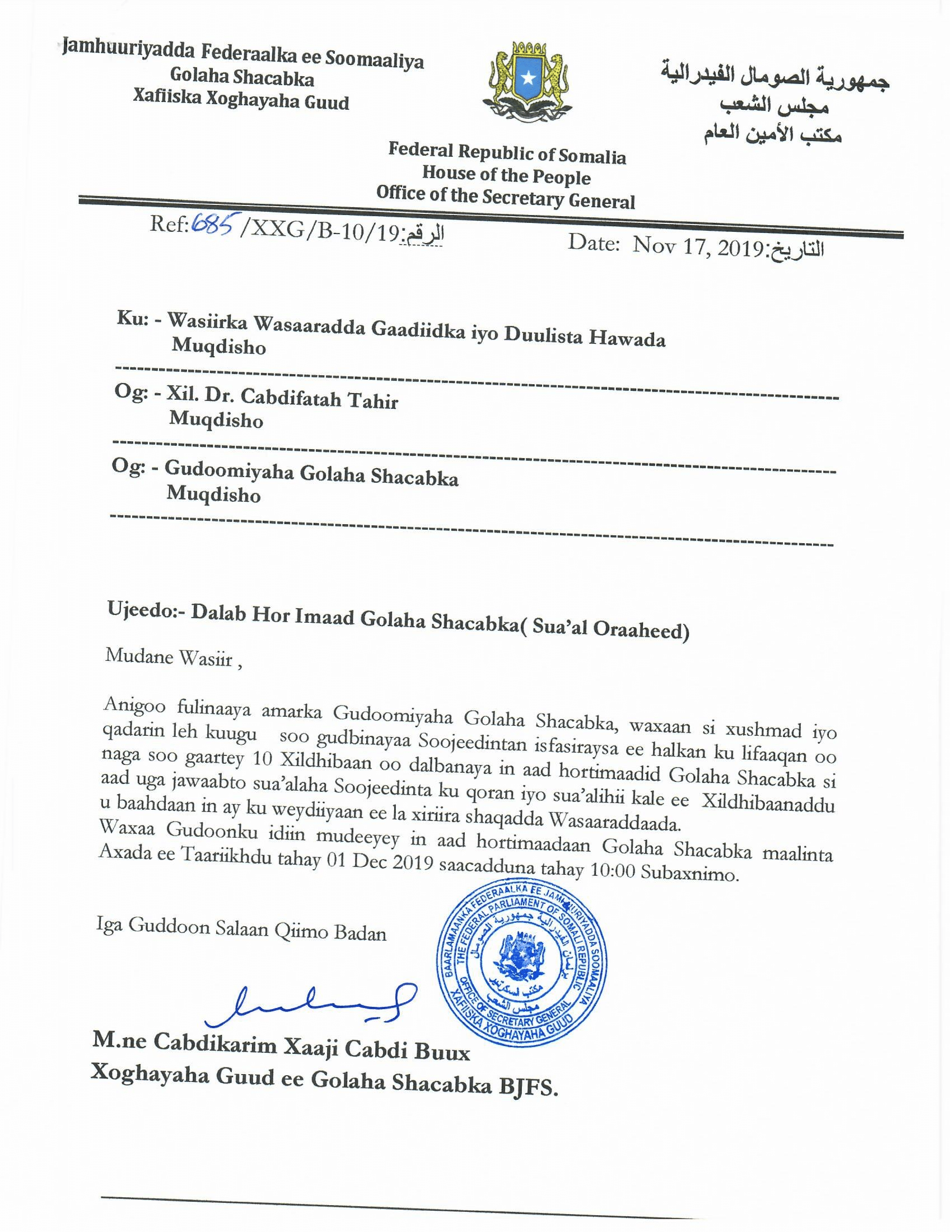 Caasimada Online ayaa heshay dhammaan warqadihii ay is-weydaarsadeen xildhibaanada u yeeray Oomaar, tii guddoonka, oo uu ka saxiixan yahay xoghayaha guud ee golaha shacabka Cabdikariin Xaaji Cabdi Buux, iyo middii Wasiir Oomaar.