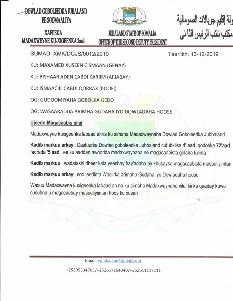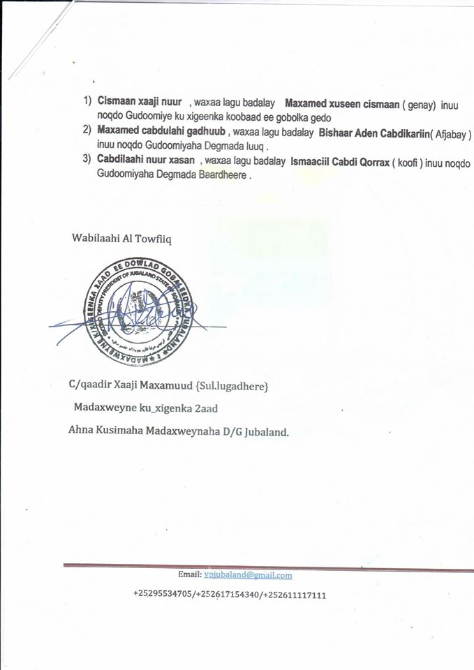 Digreeto kasoo baxdey xafiiska madaxweyne ku-xigeenka labaad ee Jubbaland mudane Cabdulqaadir Xaaji Maxamuud ayaa xilka lagaga qaadey qaar ka mid ah maamulka gobolka Gedo halka xilal loo magacaabey mas’uuliyiin cusub.