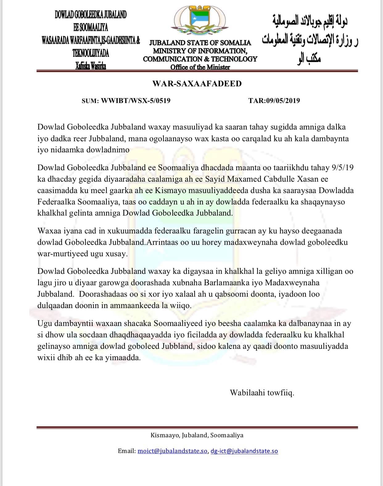 “Dowlad goboleedka Jubbaland waxay masuuliyad ka saarantahay sugidda Amniga dalka iyo dadka reer Jubbaland , mana ogolaaneyso waxkasta oo carqalad ku ah kala danbeynta iyo nidaamka dowladnimo, Jubbaland waxay caddeynaysaa inay faragalin gurracan ku hayso hambsami u socodka hanaanka doorasho ee Jubbaland taas oo ay masuuliyadeeda qaadan doonto DFS fal kasta oo liddi ku ah amniga iyo dowladnimada JJubbalan” ayaa lagu yiri War saxaafadeedka.
