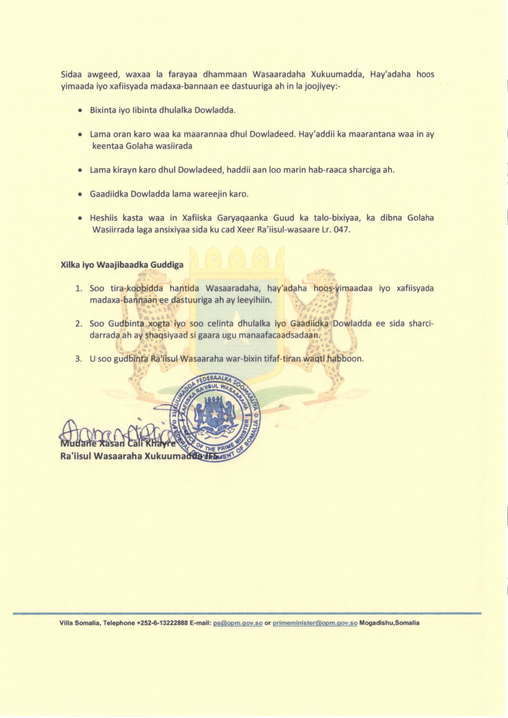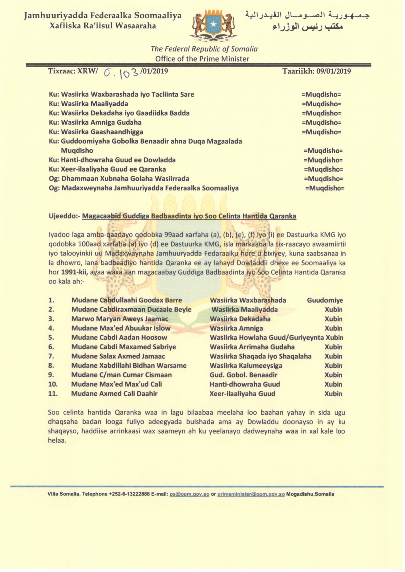 Kheyre oo magacaabay guddiga badbaadinta iyo soo celinta hantida qaranka