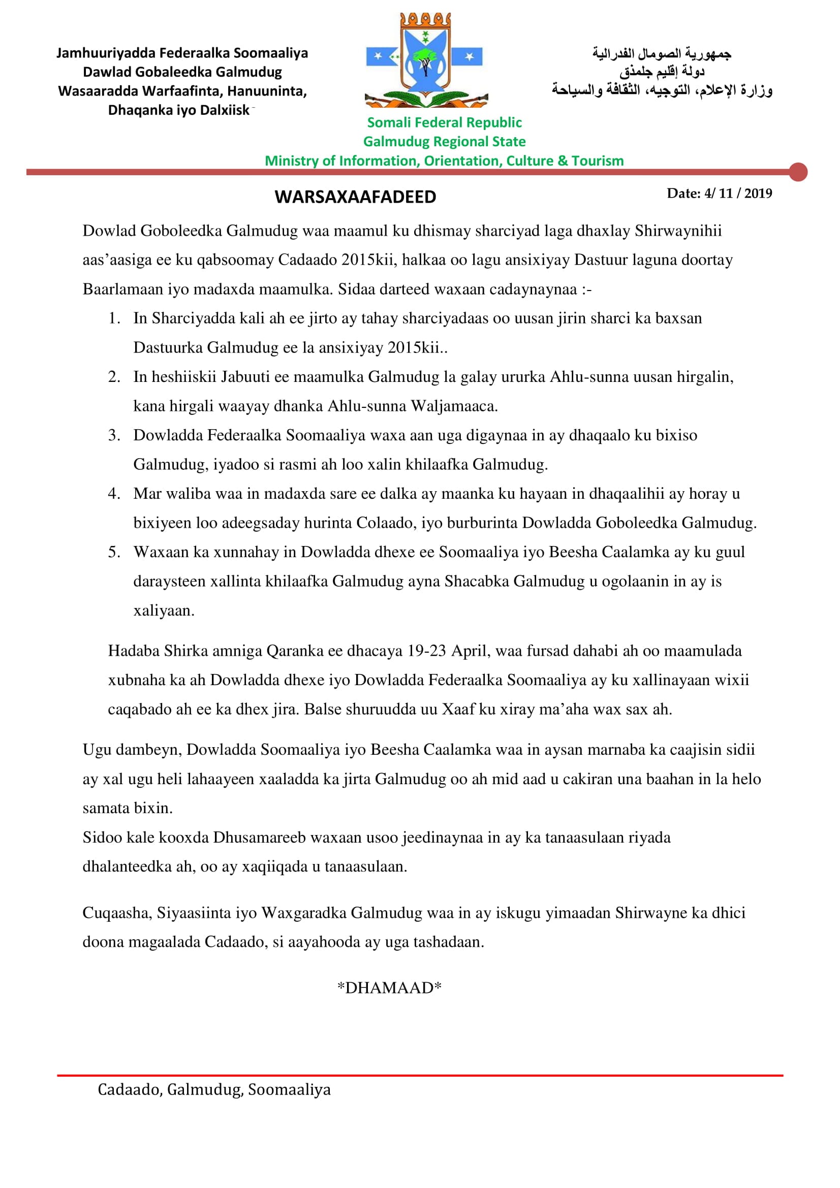 Caddaado (Caasimada Online) – Madaxweyne ku xigeenka Galmudug Maxamed Xaashi Carabey ayaa qoraal uu soo saaray ku sheegay in Galmudug ay ka qeyb-galayso shirka amniga qaranka ee madaxweyne Farmaajo uu ku baaqay inuu Muqdisho ka dhaco. Hoos ka aqriso qoraal kasoo baxay.