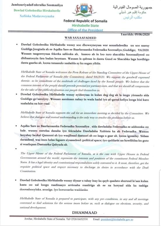 Hoose ka aqriso wareegtada Madaxweynaha Hirshabelle