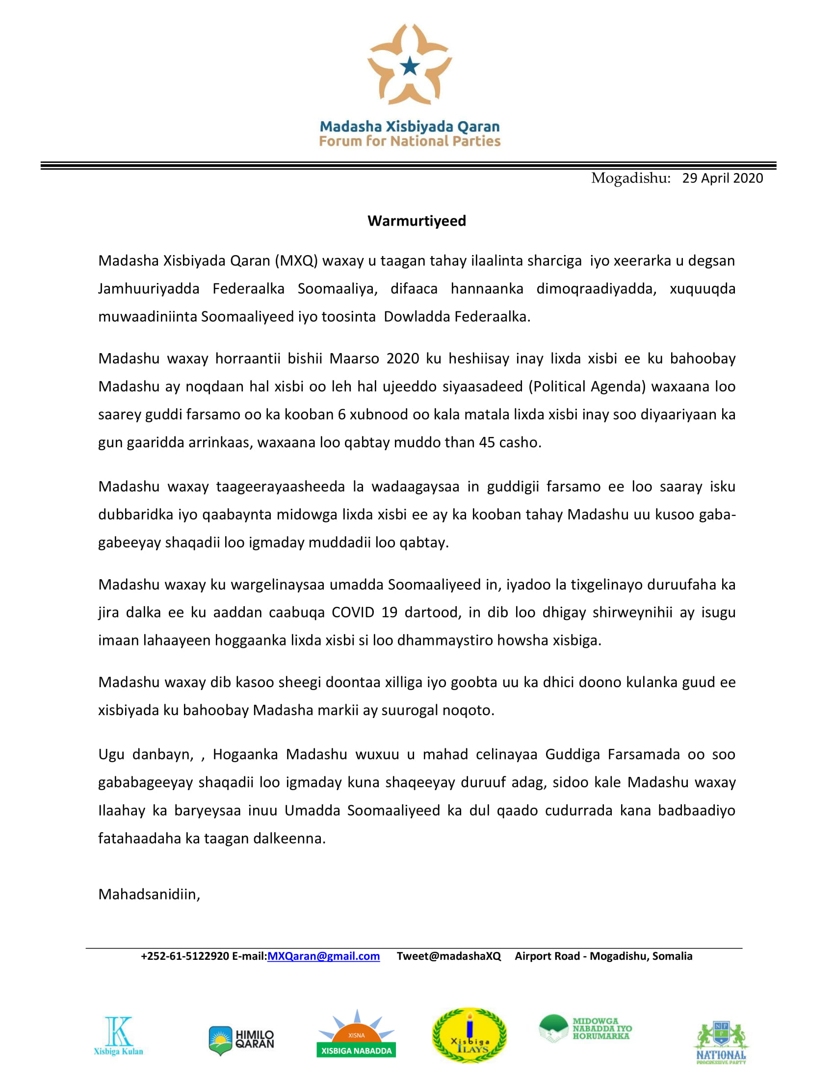 “Madashu waxay ku wargelinaysaa umadda Soomaaliyeed in, iyadoo la tixgelinayo duruufaha ka jira dalka ee ku aaddan caabuqa COVID 19 dartood, in dib loo dhigay shirweynihii ay isugu imaan lahaayeen hoggaanka lixda xisbi si loo dhammaystiro howsha xisbiga,” ayaa lagu yiri qoraalka Madasha.