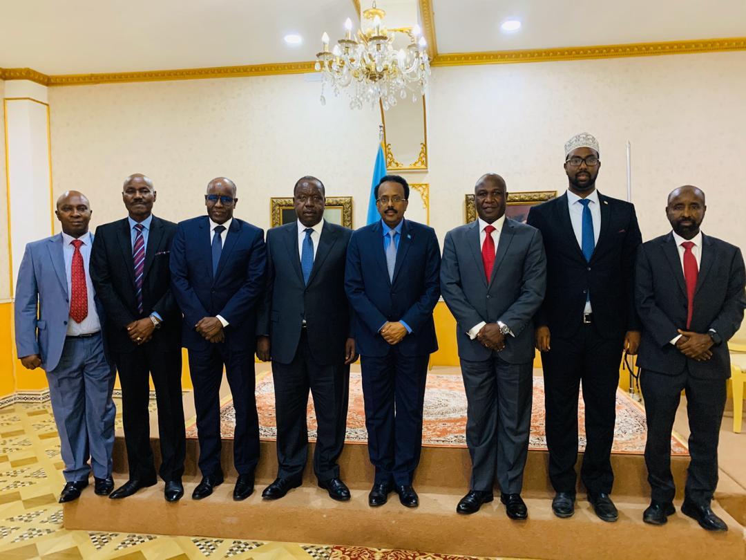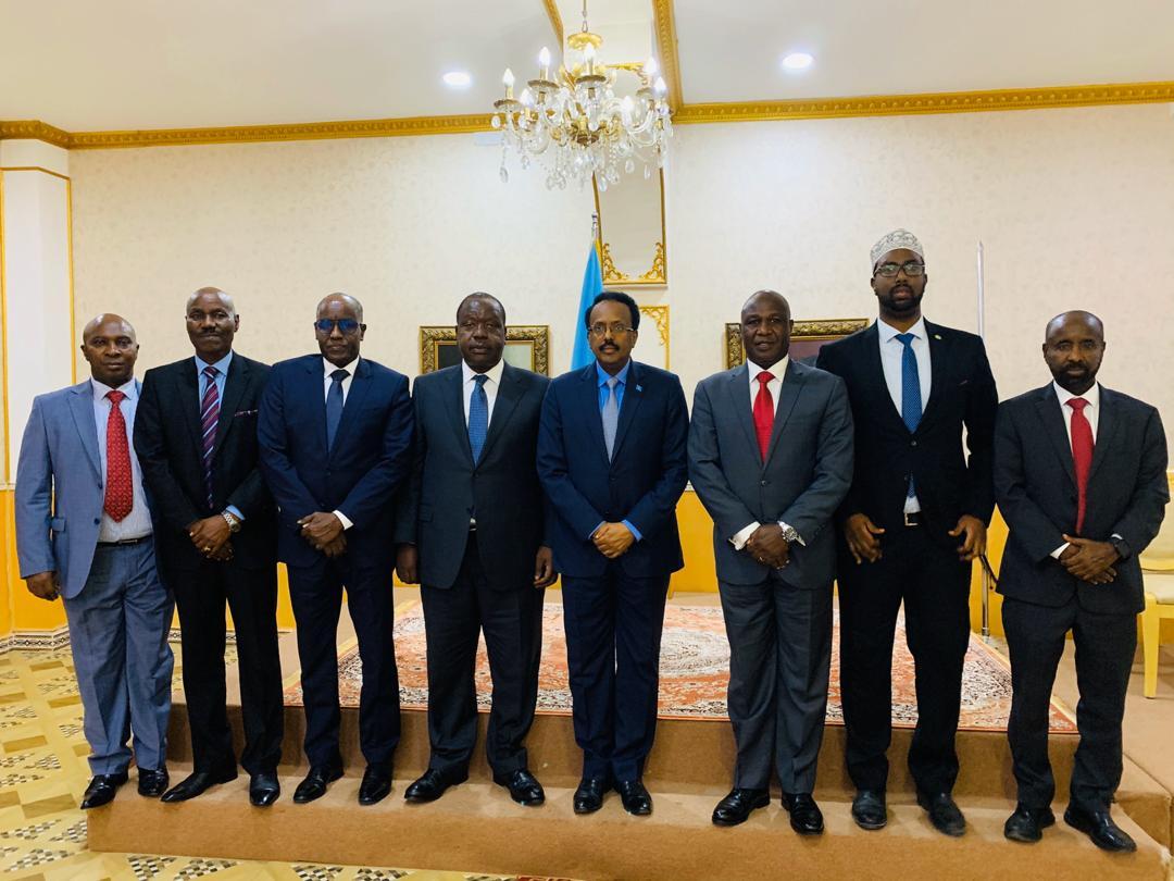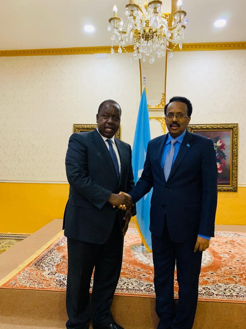 Madaxweynaha Jamhuuriyadda Federaalka Soomaaliya Mudane Maxamed Cabdullaahi Farmaajo oo kulan kula qaatay Villa Soomaaliya Wasiirka Arrimaha Gudaha Dalka Kenya Mudane Fred Matiang’i ayaa ka guddoomay dhambaal uu uga siday Madaxweynaha Kenya Mudane Uhuru Kenyatta.