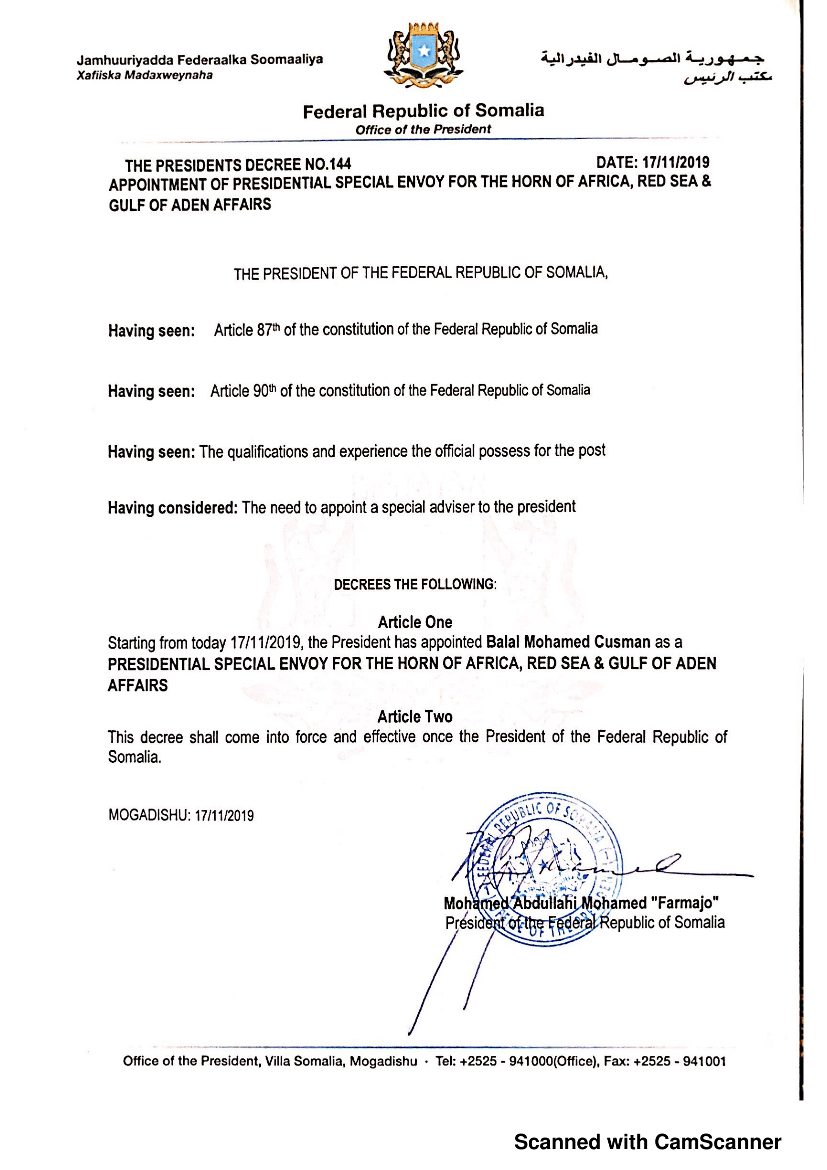 Wareegto uu soo saaray madaxweynaha oo ku taariikheysan 17-ka November, ayaa xilkan loogu magacaabay Balal Maxamed Cusmaan, oo horey uga mid ahaa la-taliyayaasha madaxweynaha.