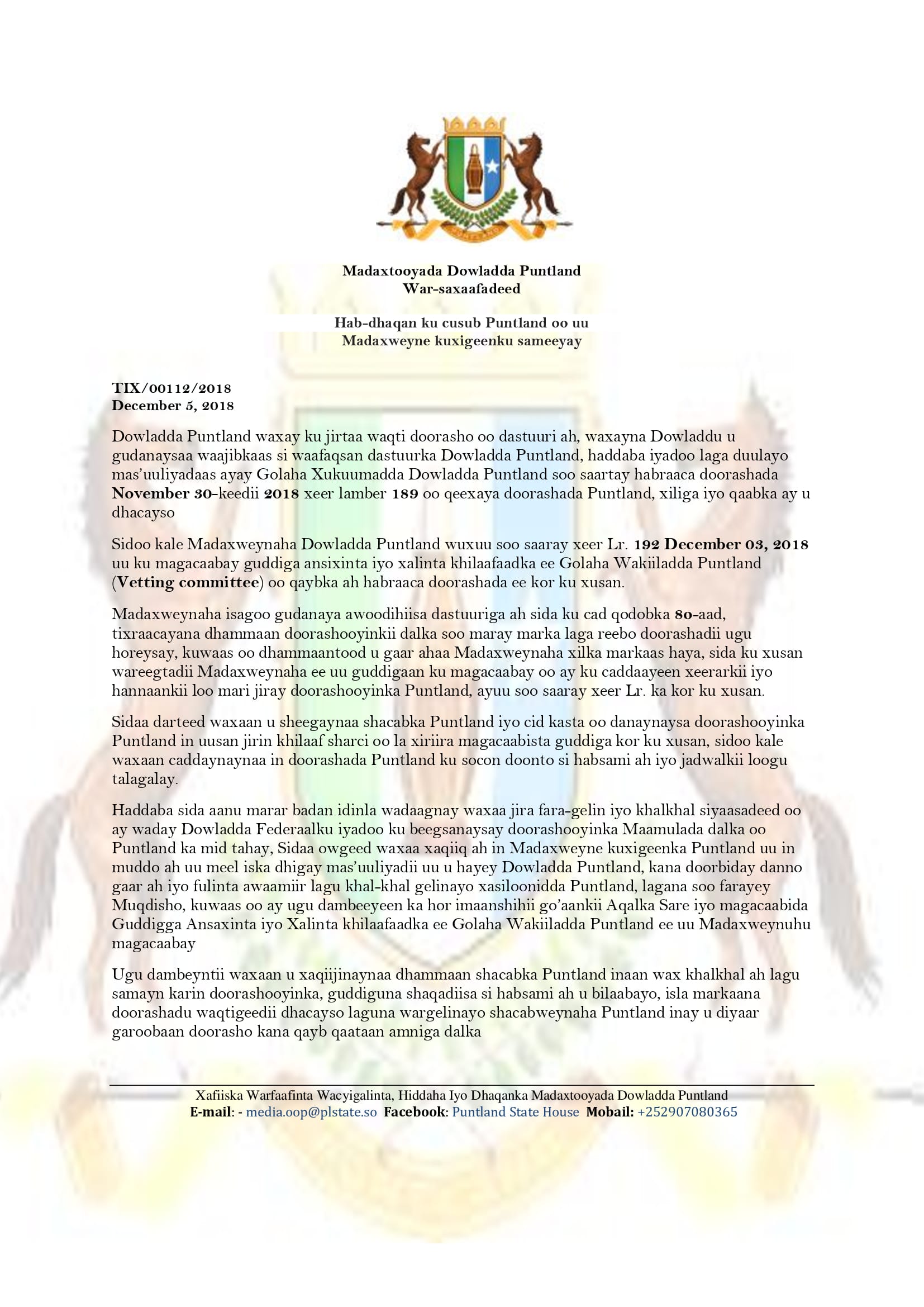 Halkaan hoose ka akhriso warka qoraalka ah ee kasoo baxay Maamulka Puntland ee lagu eedeeyay dowladda dhexe ee Soomaaliya.