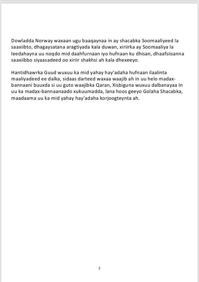 “Dowladda Norway waxaan ugu baaqeynaa in shacabka Soomaaliyeed ay la saaxiibto, dhageysatana aragtiyada kala duwan, xiriirka ay Soomaaliya la leedahana uu noqdo mid daah furnaan iyo hufnaan ku dhisan, dhaafsiisana saaxiibo siyaasadeed oo xiriir shakhsi ah kala dhaxeeyo”.