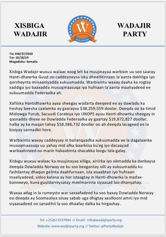Muqdisho-(Caasimada Online) – Xisbiga Wadajir ayaa war-saxaafadeed ka soo saaray warbixintii hanti dhawrka guud ee qaranka iyo lacagtii ay dowladda Norway deymisay Soomaaliya.