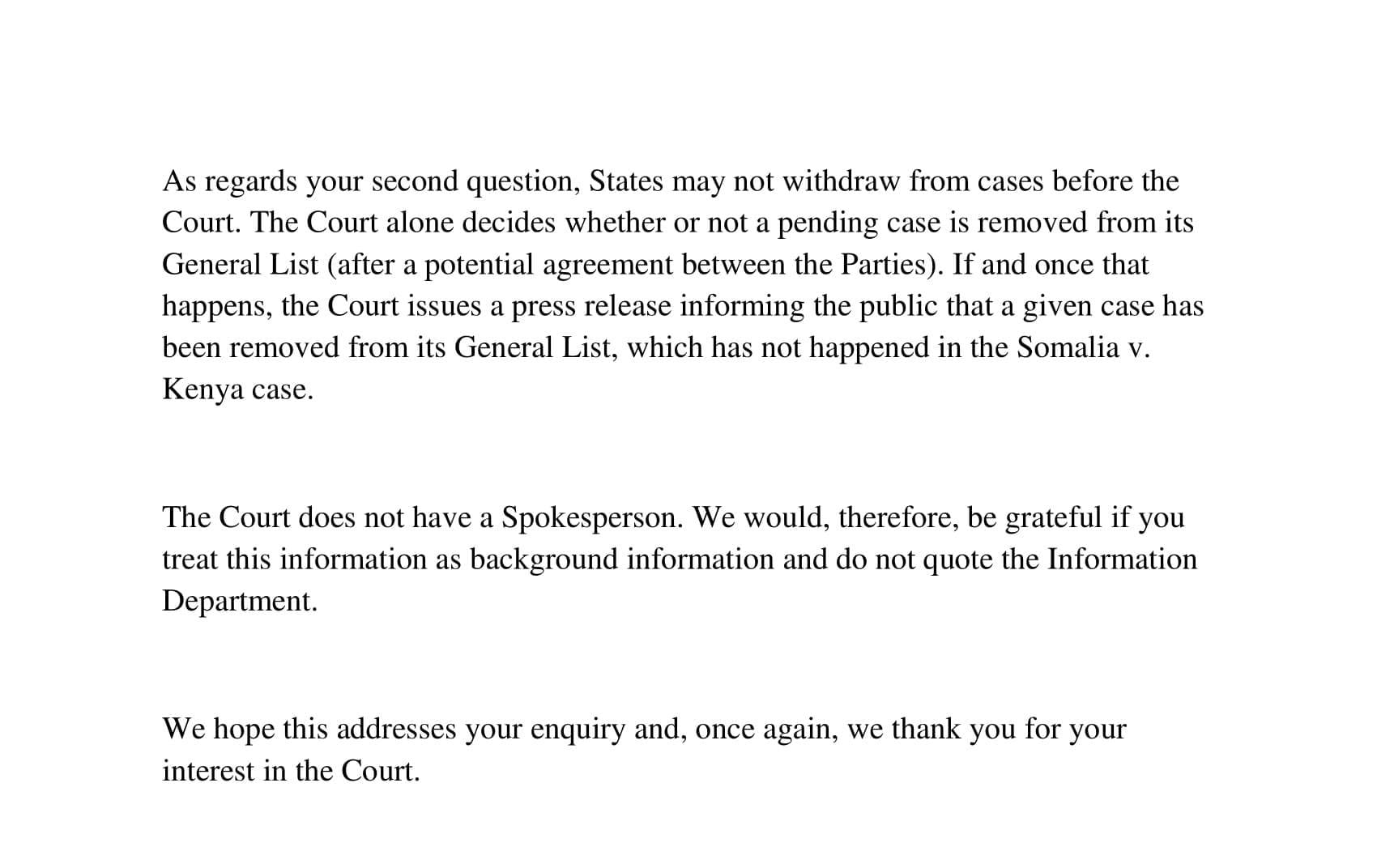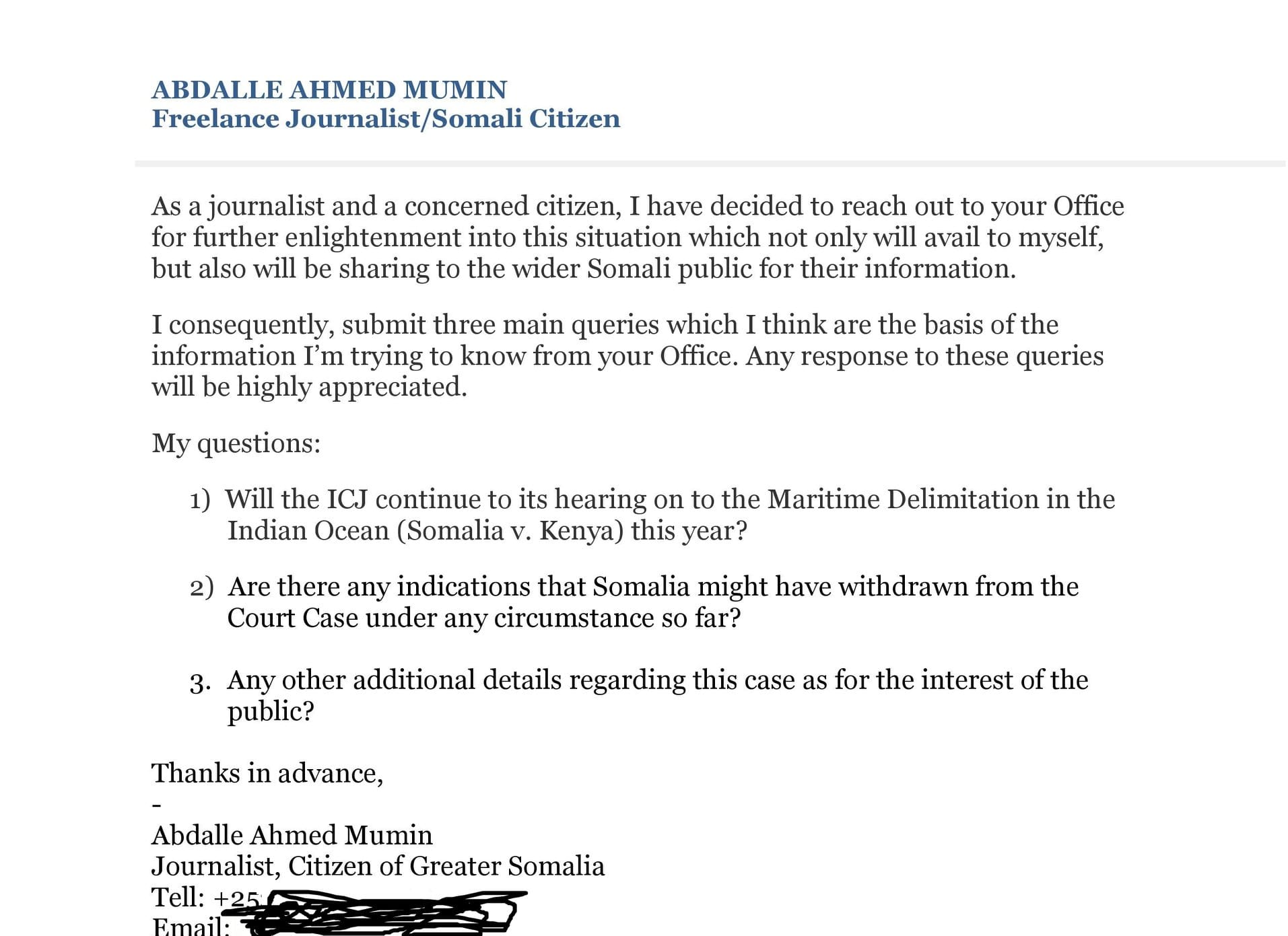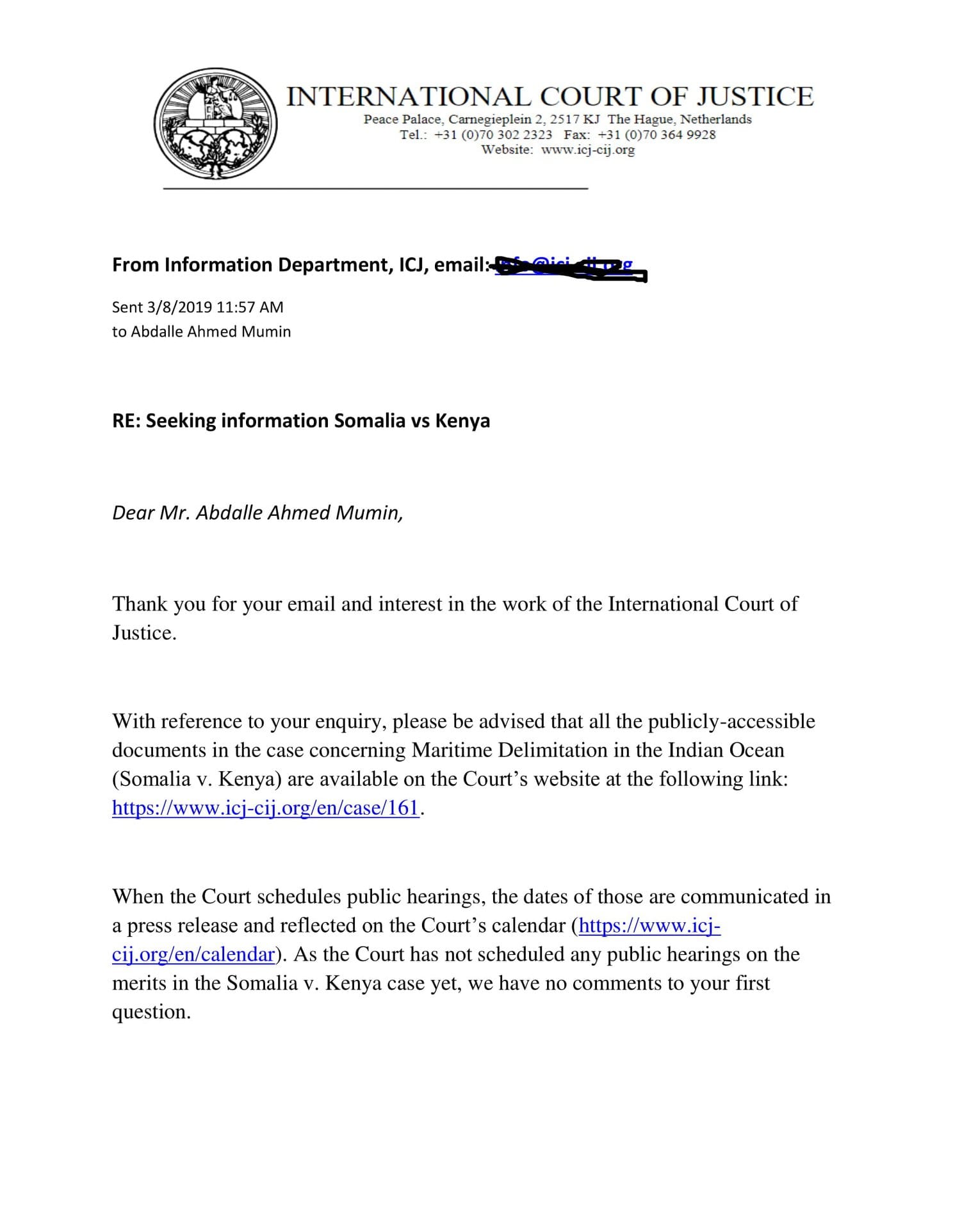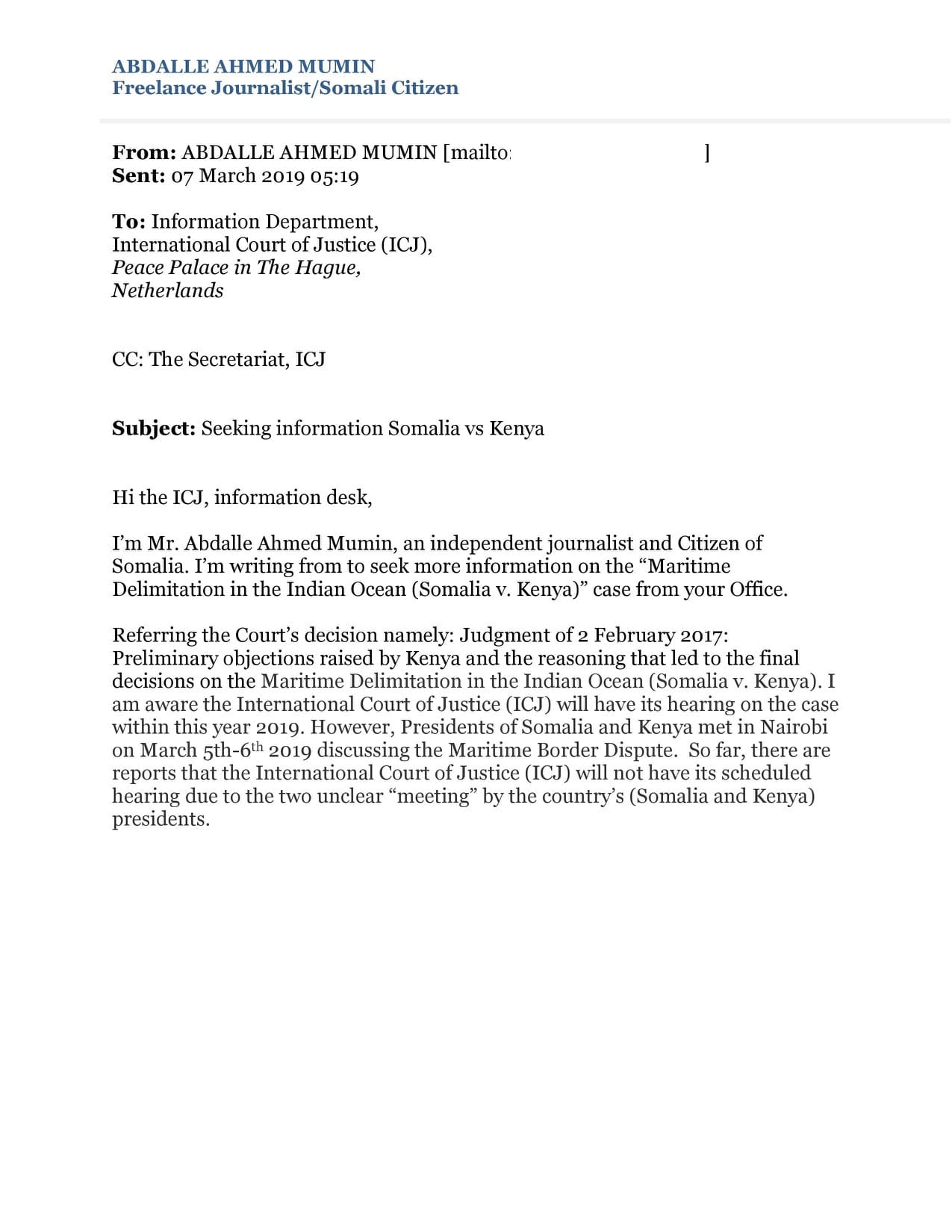 7-dii bishan Maarso, ayaan warqad u diray Xafiiska Waaxda Macluumaadka ee Maxkamadda Caalamiga ee Caddaaladda (International Court of Justice ICJ) oo deggan magaalada Hague, Netherland.