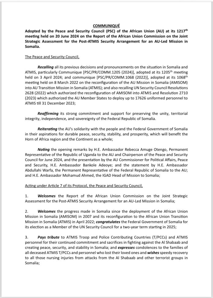 Muqdisho (Caasimada Online) – Golaha Nabadda iyo Ammaanka ee Midowga Afrika ayaa taageeray in la sameeyo howlgal cusub oo Midowga Afrika uu hoggaamiyo, maadaama howlgalka hadda socda ee ATMIS uu dhamaanayo bisha December ee sanadkaan 2024.
