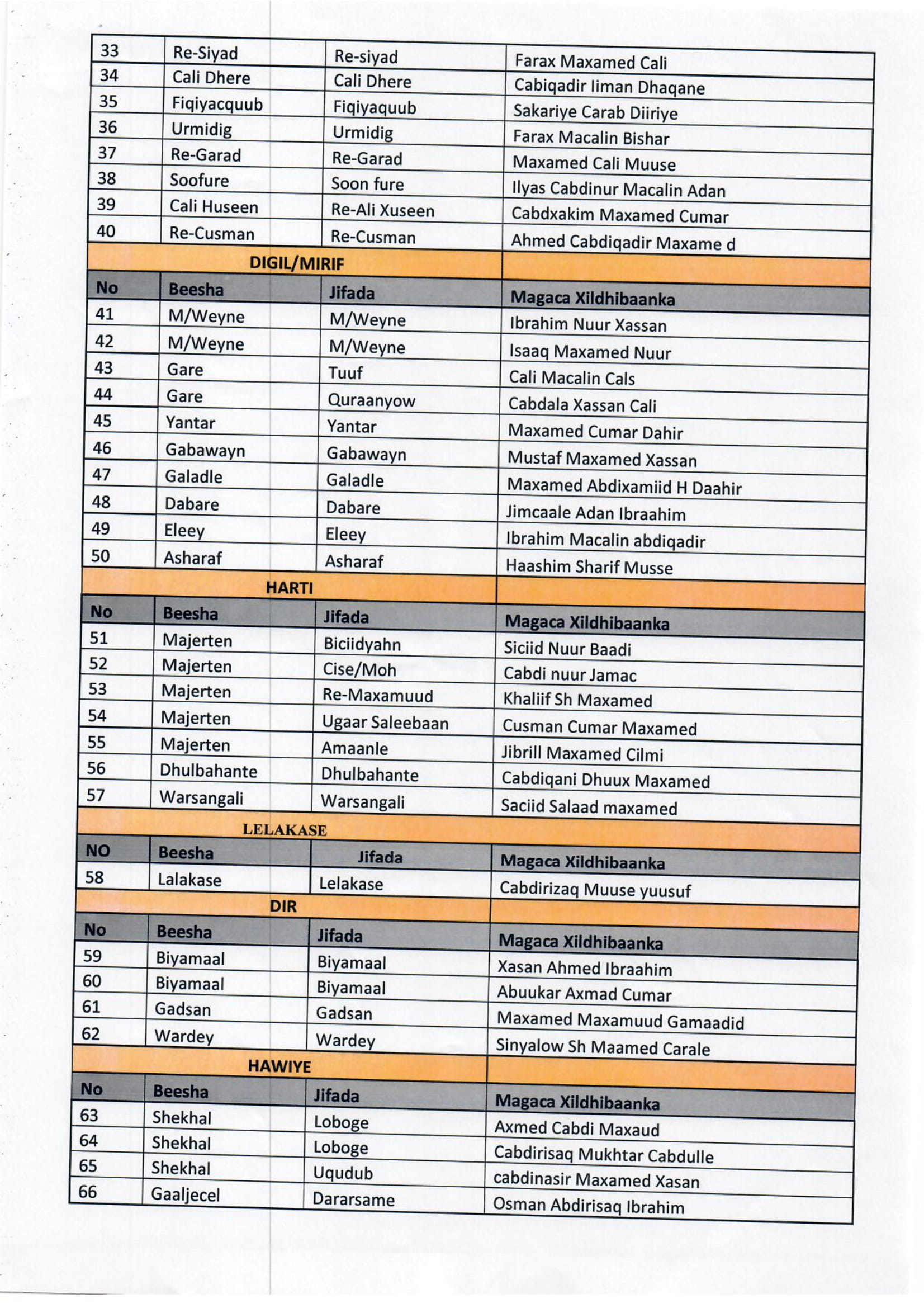 Sidoo kale liiska ayaa waxaa ka muuqda magacyada iyo beelaha ay ka soo jeedaan xildhibaanada cusub.