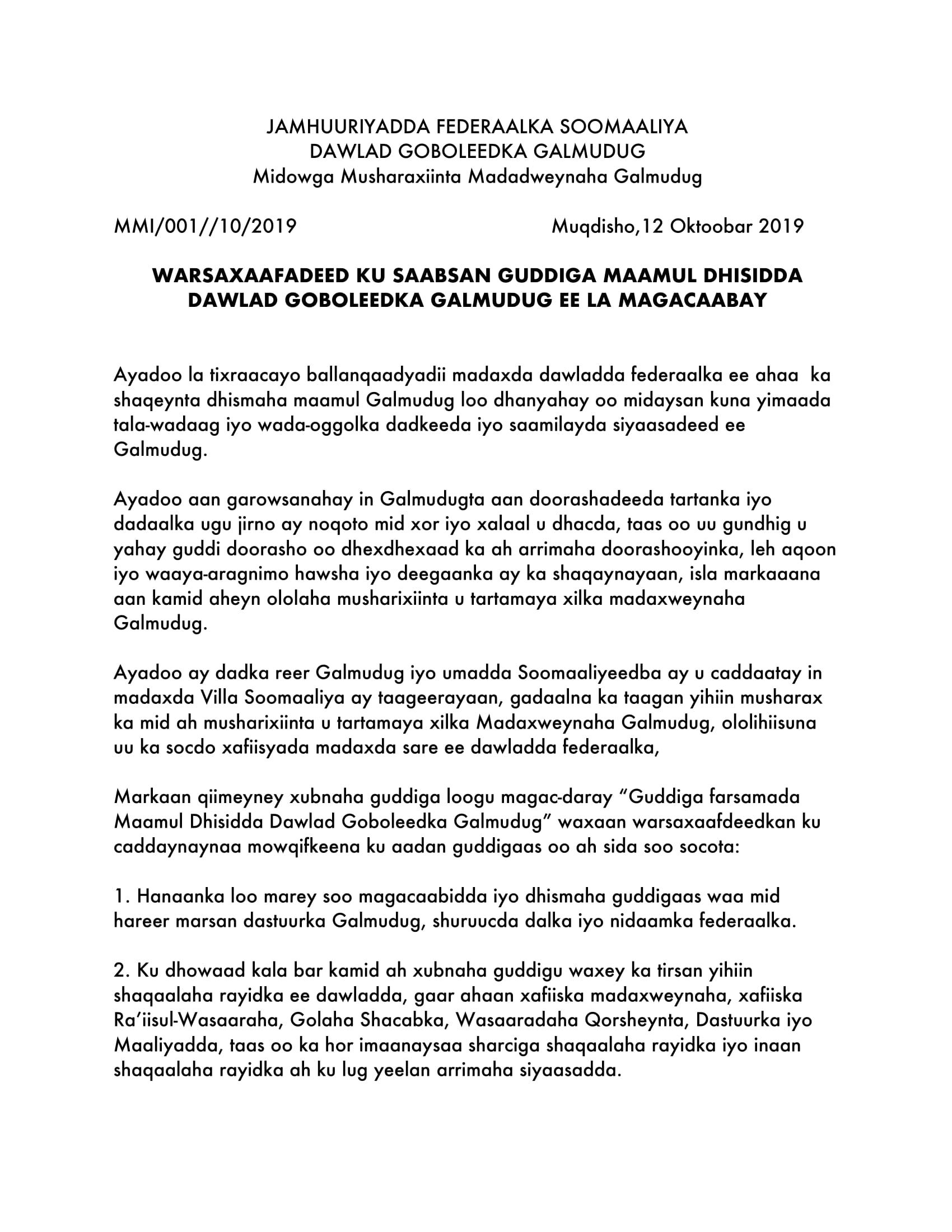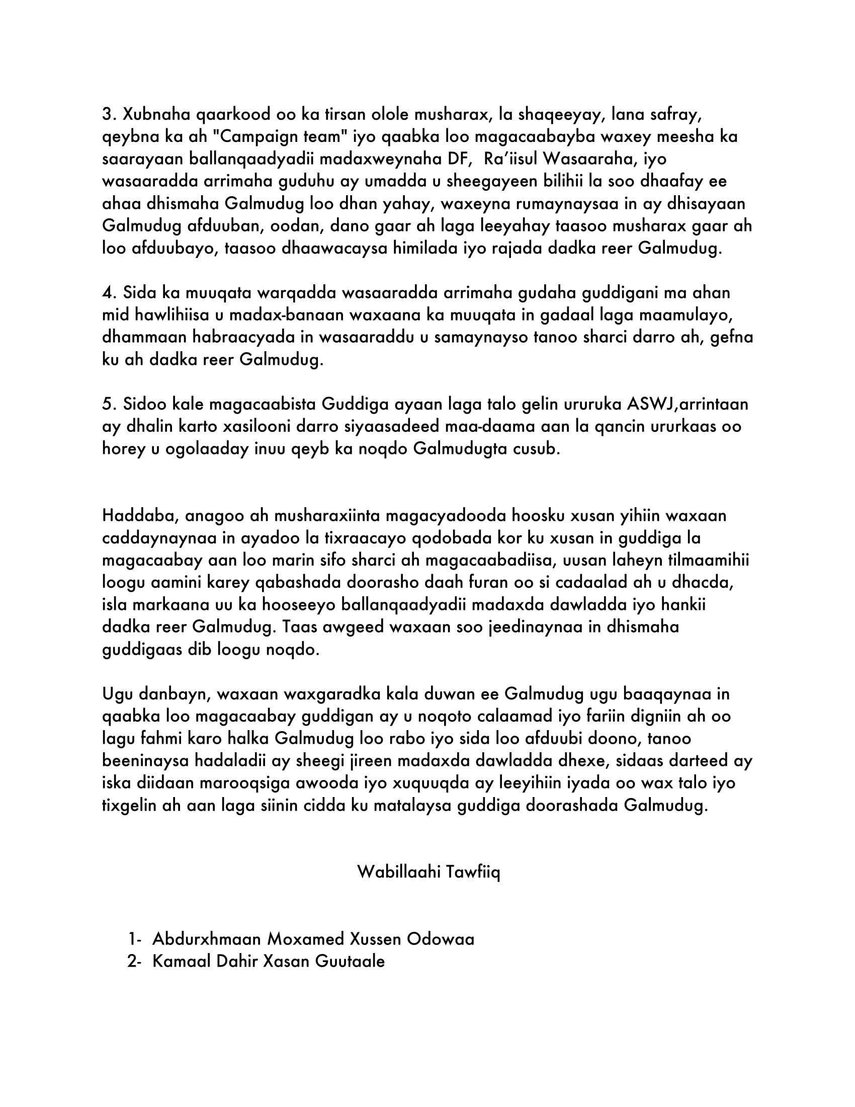 Labada Musharrax oo si wadajir u soo saaray war qoraal ah ayaa sheegay in hanaanka loo maray guddigaasi uu hareer marsanyahay Dastuurka Galmudug iyo shuruucda dalka.