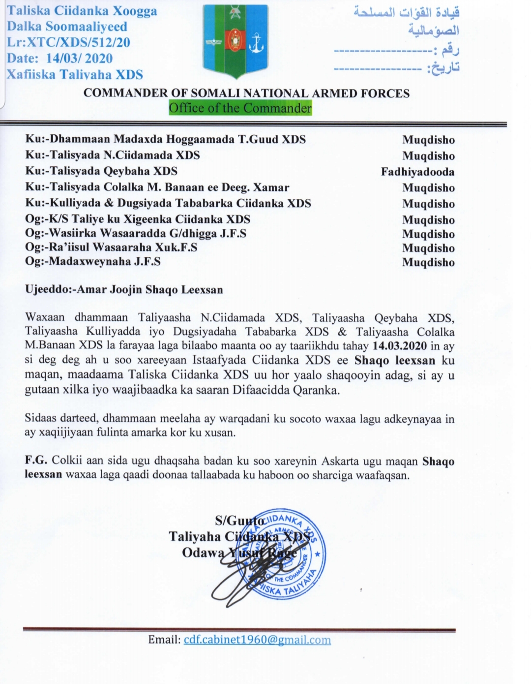 “Dhamaan taliyaasha XDS, taliyaasha qeybaha XDS, taliyaasha kulyadaha iyo dugsiyada tababarka XDS iyo taliyaasha colalka madaxa banaan XDS, waxaa la farayaa laga bilaabo 14-03-2020, in ay si degdeg ah u soo xareeyaan istaafyada ciidanka XDS ee shaqo leexsan ku maqan, maadaama taliska ciidanka xoogga dalka ay horyaalaan shaqooyin adag si ay u gutaan xilka iyo waajibaadka ka saran difaaca qaranka” ayaa lagu yiri warqadda.