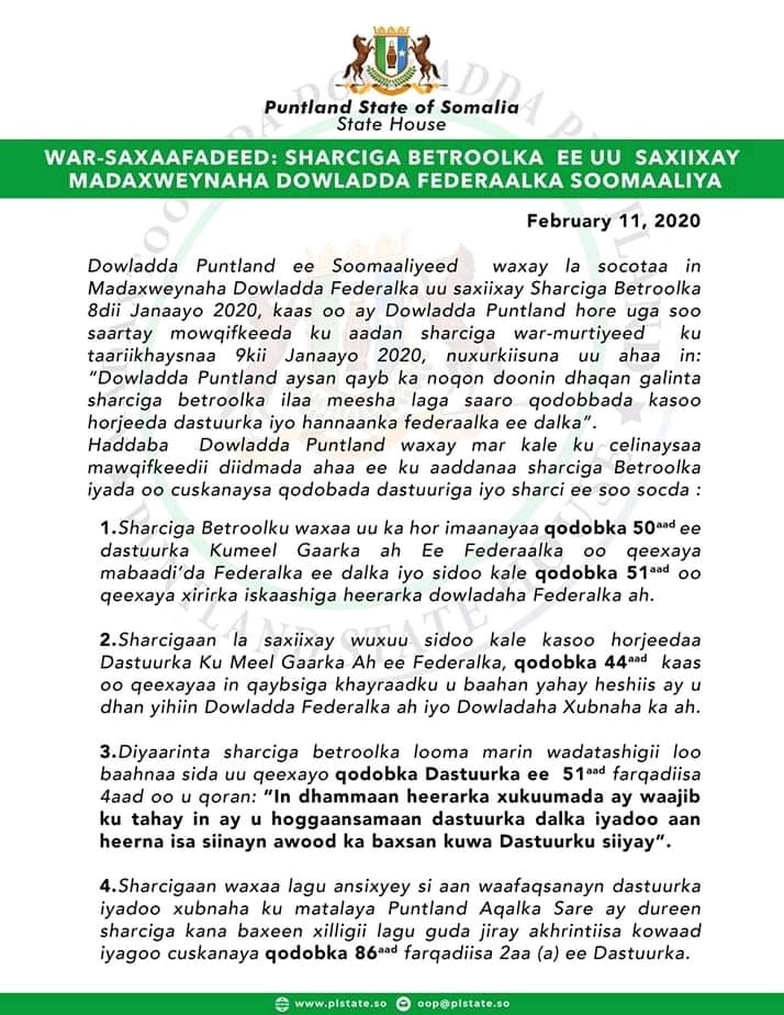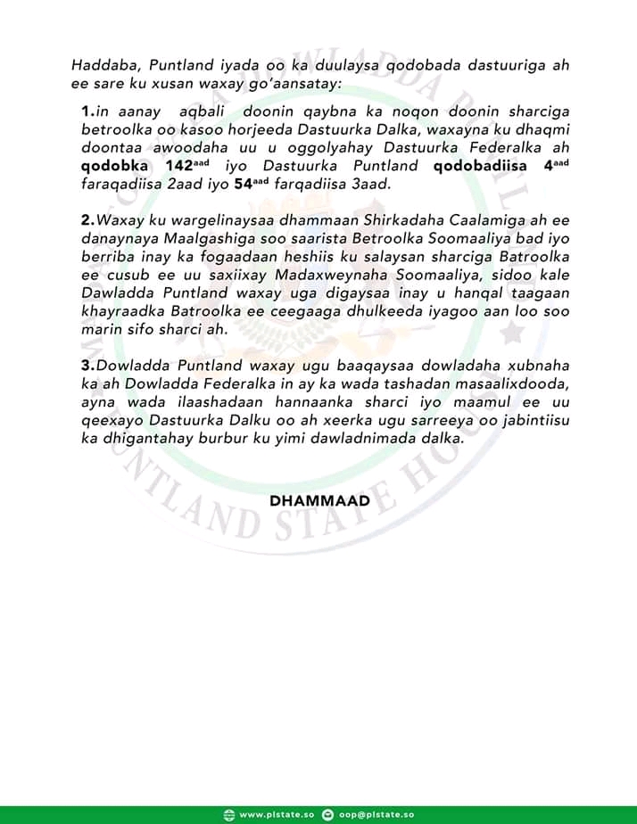 Qoraal kasoo baxay madaxtooyada Puntland ayaa lagu sheegay in sharcigaas ay ku jiraan qodobo “kasoo horjeeda dastuurka qaranka iyo hanaanka federaalka ee lagu heshiiyey,” illaa laga saarayana aysan qeyb ka noqon doonin fulintiisa.