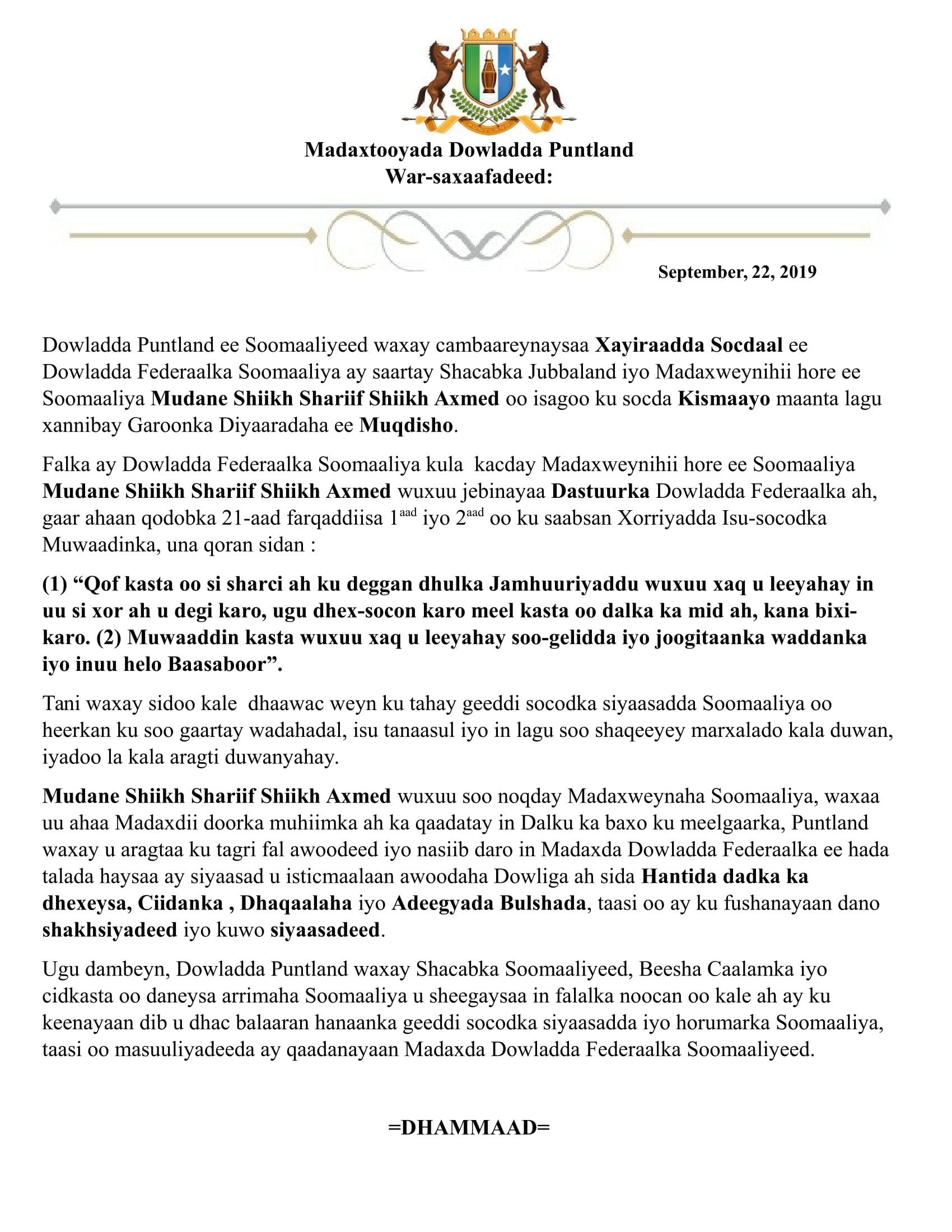 Ugu dambeyntii war-saxaafadeedka Puntland ayaa lagu yiri, “Puntland waxay shacabka Soomaaliyeed, beesha caalamka iyo cid kasta oo daneysa arimaha Soomaaliya u sheegaysaa in falalka nuucaan oo kale ah ay ku keenayaan dib u dhac balaaran hanaanka geedi socodka siyaasadda iyo horumarka Soomaaliya, taas oo mas’uuliyadeeda ay qaadanayaan madaxda dowladda federaalka Soomaaliya”.