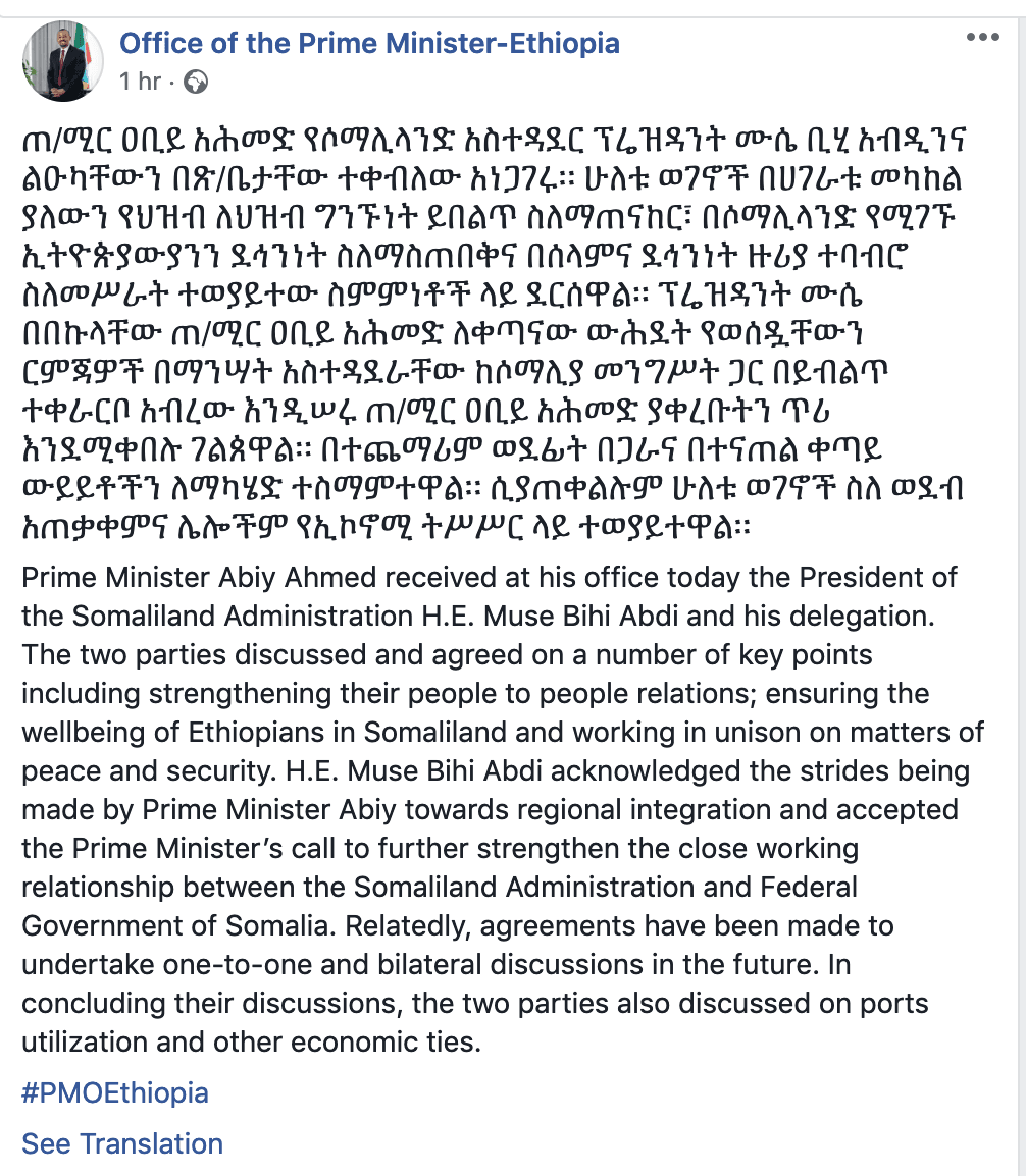 “Ra’iisul wasaare Abiy Ahmed waxa uu maanta xafiiskiisa ku qaabilay madaxweynaha Maamulka Somaliland Muuse Biixi Cabdi iyo waftigiisa. Labada dhinac ayaa ka hadlay iskuna raacay dhowr qodob oo muhiim ah oo ay ku jiraan xiriirka dadkooda, xaqiijinta fayo-qabka dadka Itoobiyaanka ah ee jooga Somaliland iyo ka shaqeynta arrimaha mideeya labada dhinac ee nabadda iyo amniga.