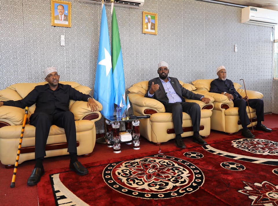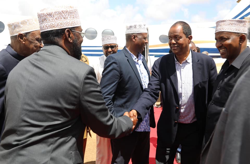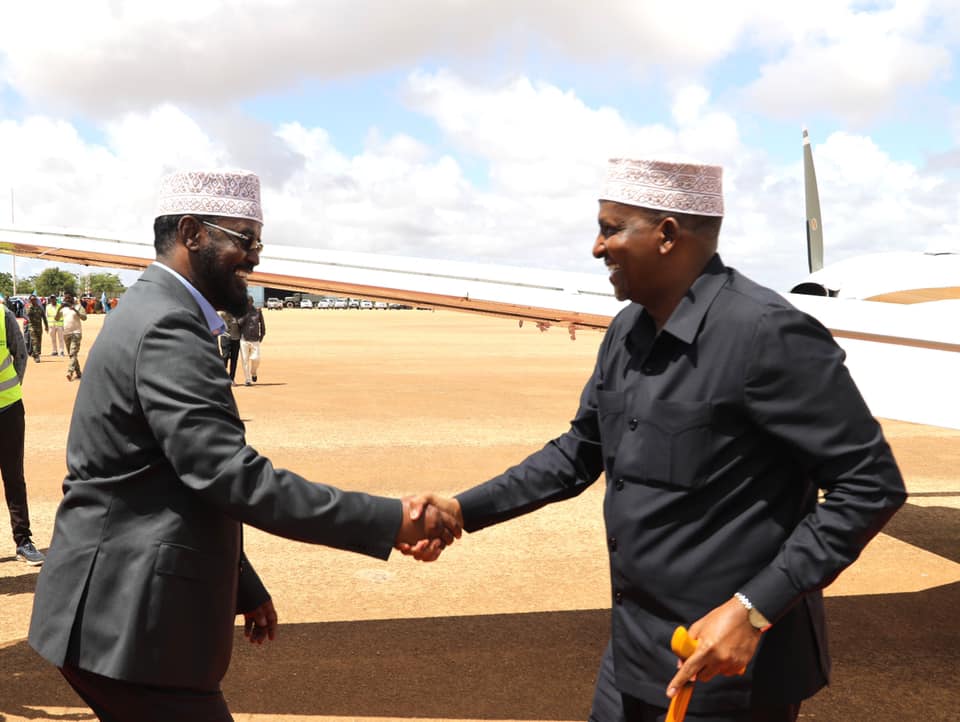 Aadan Barre Ducaale oo ah Soomaali Kenyaan iyo wafdigiisa waxaa Kismaayo ku soo dhoweeyey Madaxweynaha Jubbaland, Axmed Maxamed Islaam (Axmed Madoobe).