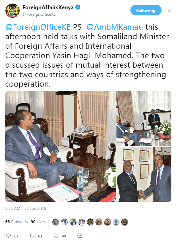 Qoraalka ayaa u dhignaa sidan “Ambassador Macharia Kamau ayaa galabta wada-hadallo la yeeshay wasiirka arrimaha dibedda iyo iskaashiga caalamiga ah ee Somaliland Yaasiin Xaaji Faratoon. Labada dhinac ayaa ka xaajooday danta guud ee LABADA DAL iyo sida ay ku xoojin karaan wada-shaqeyntooda”.