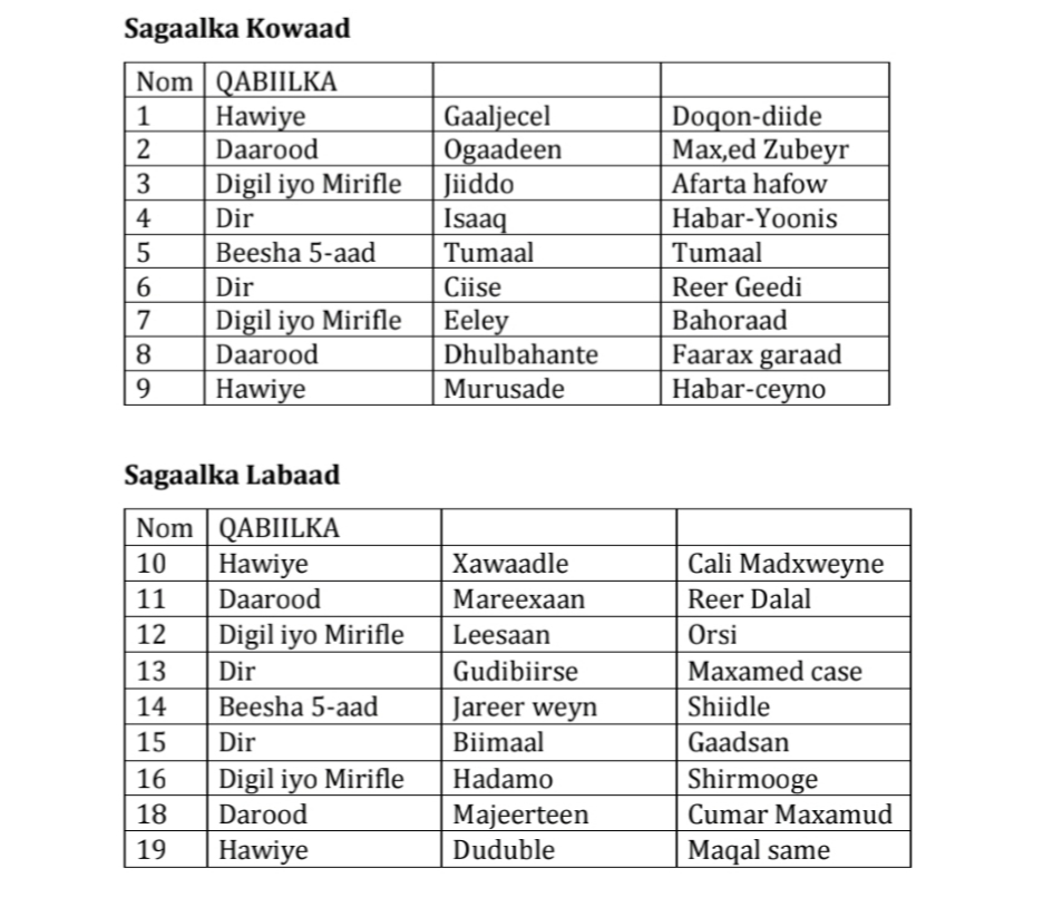 Shaxdan tusaalaha ah waxaaa ay tahay in faham guud laga qaato habka isudheelitirka Beelaha iyo sida la isku dhexgalinayo, taas oo macnaheedu tahay in Sharcigu uu diidan yahay in Xisbiyada Beel gaar ah siiyaan xubno kabadan inti ay ku lahayd baarlamaanka hadda jira, isla markaana Xisbiyada ay noqon waayaan Xisbiyo beelaha wada matalo, Sidaas darraadeed ayuu Qodobka 22-aad Faqraddiisa 6-aad uga hadlay isku dheelitirka Beelaha Soomaaliyeed sida shaxda kore ku xusan, balse Xisbiyada waxaa ay xur u yihiin sida ay doonaan in ay u kala hormarinayaan liiska 275-ta musharax ay gudbinayaan iyagoo ku jaan goynaya shaxda 30-ka xirmo ee sagaaleyda ah Beeluhuna u dhan yihiin.